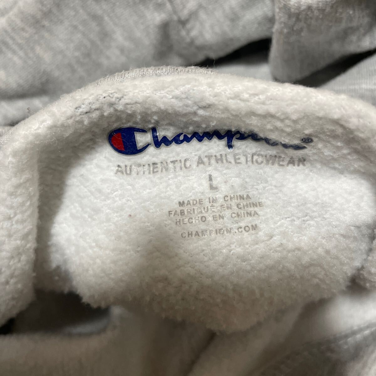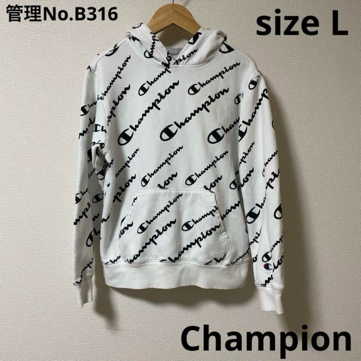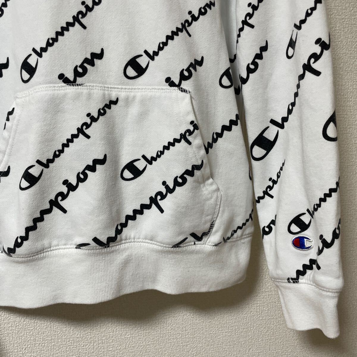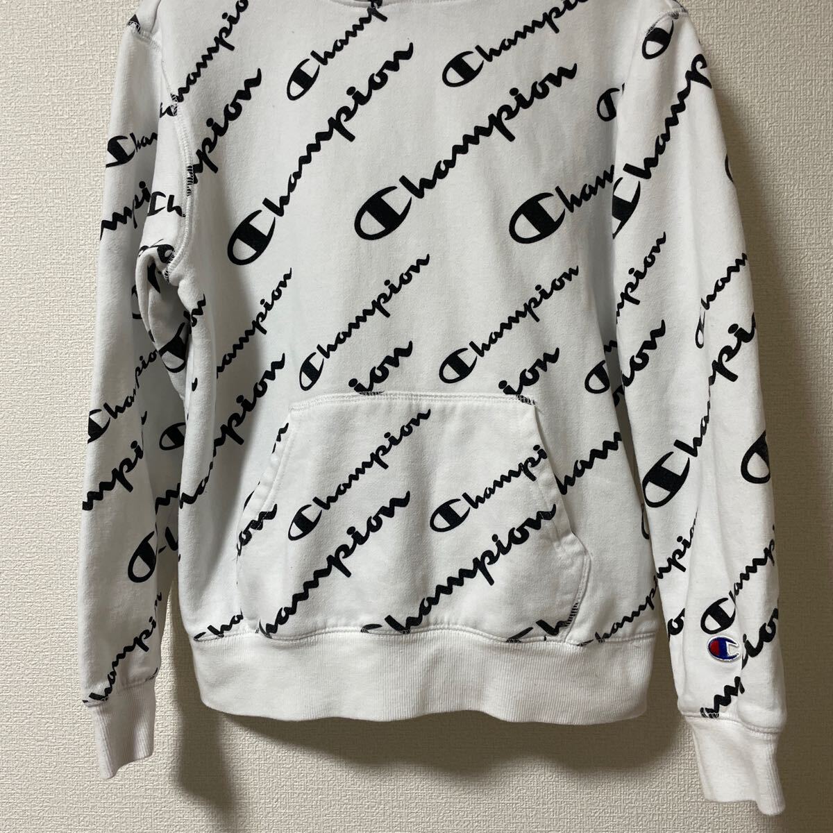 ホワイトのChampionロゴが特徴的なフード付きパーカー。