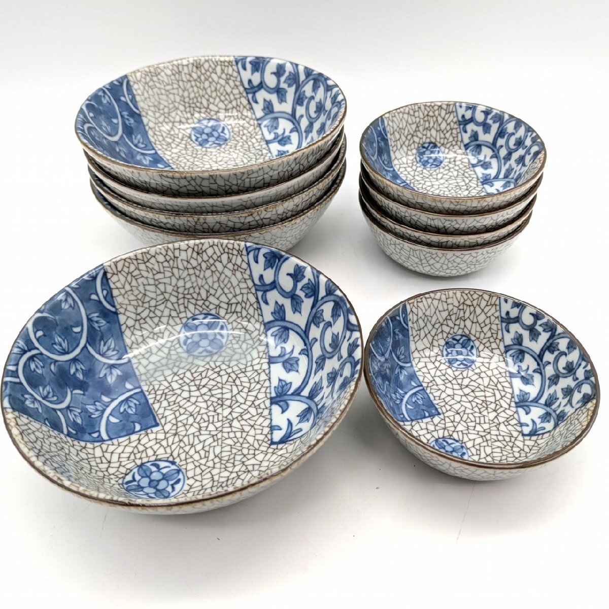 親鉢サイズ(直径×高さ):約135×48㎜、子鉢サイズ:約93×35㎜、個数:親鉢5個、子鉢5個、計10個セット、状態ランク:C 商品は画像に写っているものが全てです。鉢本体に目立つキズやヨゴレはありません。付属木箱の棚板に破損が見受けられます。その他状態は画像をご確認ください。