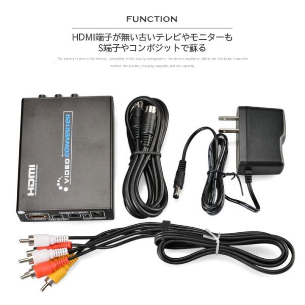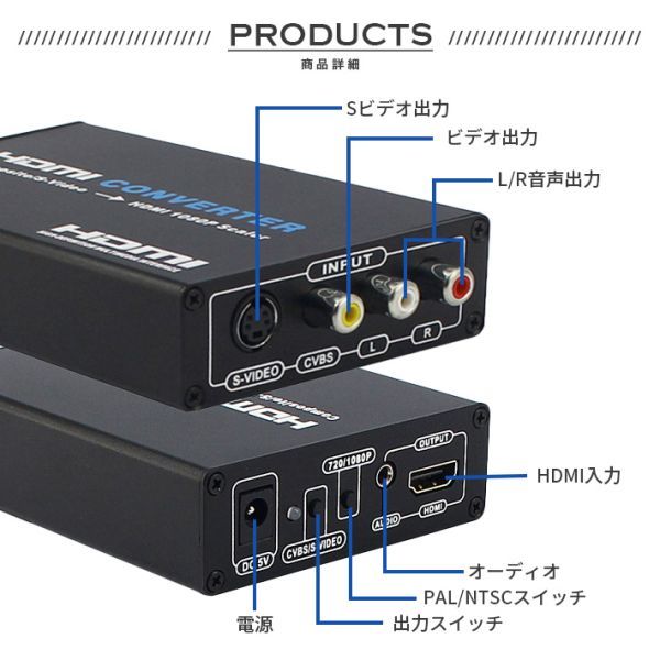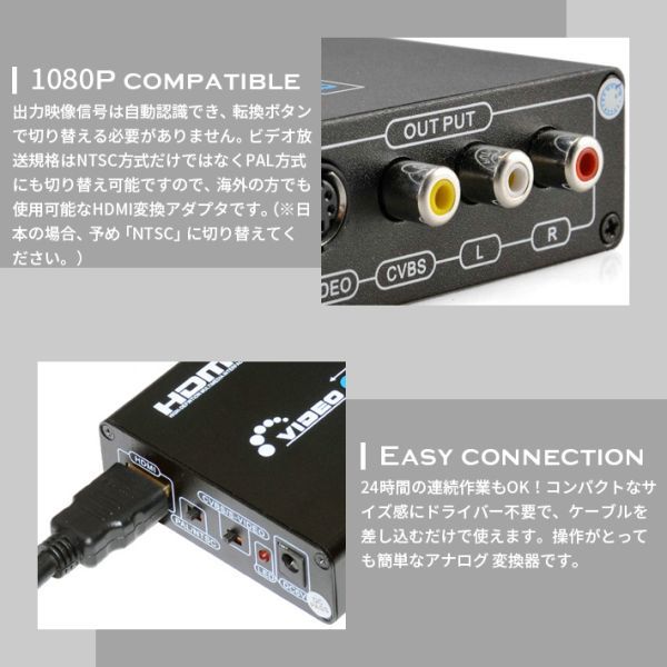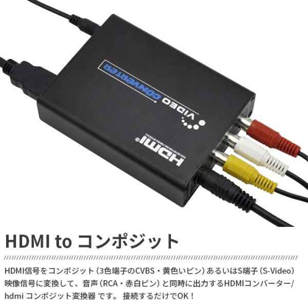 本品はHDMI信号をコンポジット(3色端子のCVBS・黄色いピン)或いはS端子(S-Video)映像信号に変換して、音声(RCA・赤白ピン)と同時に出力するHDMIコンバーター/ hdmi コンポジット変換器 です。 接続するだけでOK!