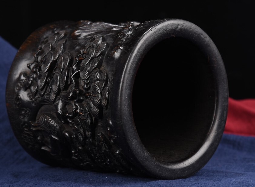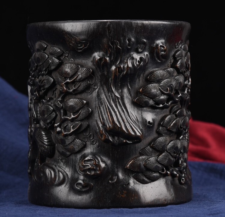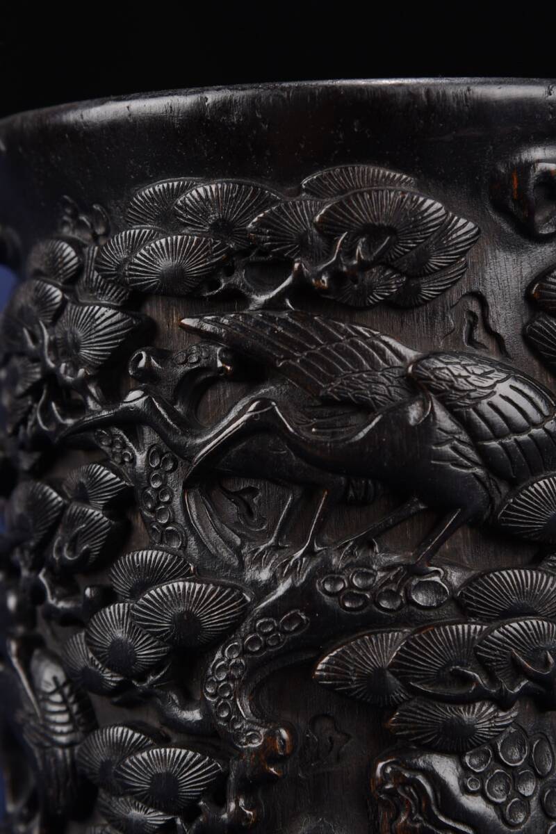 *珍品旧蔵* 清代 烏木彫刻 松鶴延年 筆立て 手彫り 置物 細密彫 唐物 時代物 古賞物 中国古玩 k0116