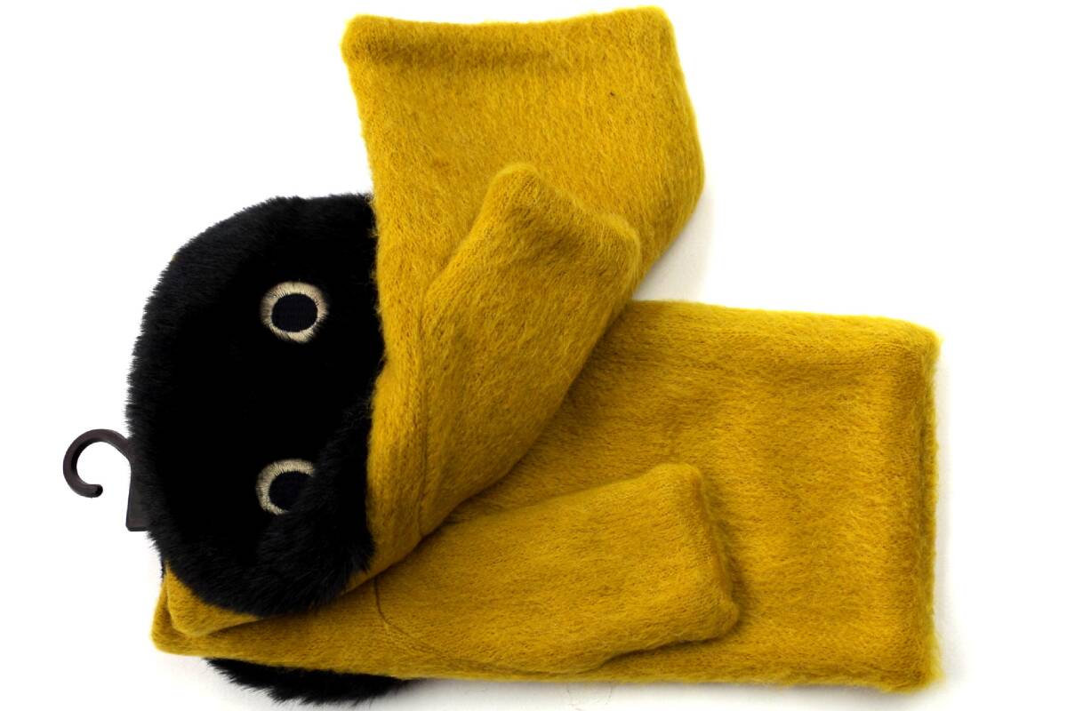 マタノアツコAtsukoMatanoのふわふわクロネコフィンガーレス手袋 、新品です。色はマスタードです。 素材は本体:アクリル、ウール。装飾品:ポリエステル100%。裏地:ポリエステル100%の裏フリースであたたかな作りです。表記寸法:21-22㎝。実寸で全長約19㎝です。 正規ライセンス会社扱い品です。