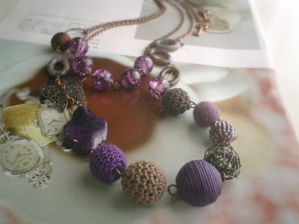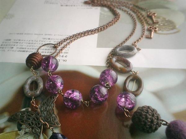 巴里・ロゼッタシリーズです♪ロマンチックを見つけて!シックなパープルの異素材を集めた可憐なネックレス2本セットです!シックなお色でまとめてアンティークな雰囲気です♪深いパープルのクラックが入った樹脂ビーズは12ミリの丸玉です♪長さは全長55センチ位で調節自由です♪チョーカー風にされたりブレスにされても可愛いです♪12ミリから40ミリ位までの樹脂ビーズやフェルト玉や編みボールやワイヤーボールやビーズ玉を集めたネックレスは蝶のメタルチャームやピーターサイトのリングを合わせて可憐な表情です♪長さは85センチ位で調節自由です♪2連にされても素敵です♪単品やブレスレットも出品しています♪シンプルで飽きのこないいつまでも着けられるデザインを考えて作りました!お揃いのブレスレットも出品しています♪ハンドメイドをご理解頂いてノークレーム、ノーリターンでお願いします