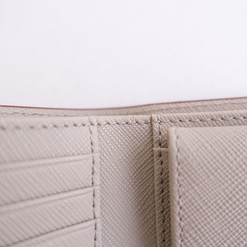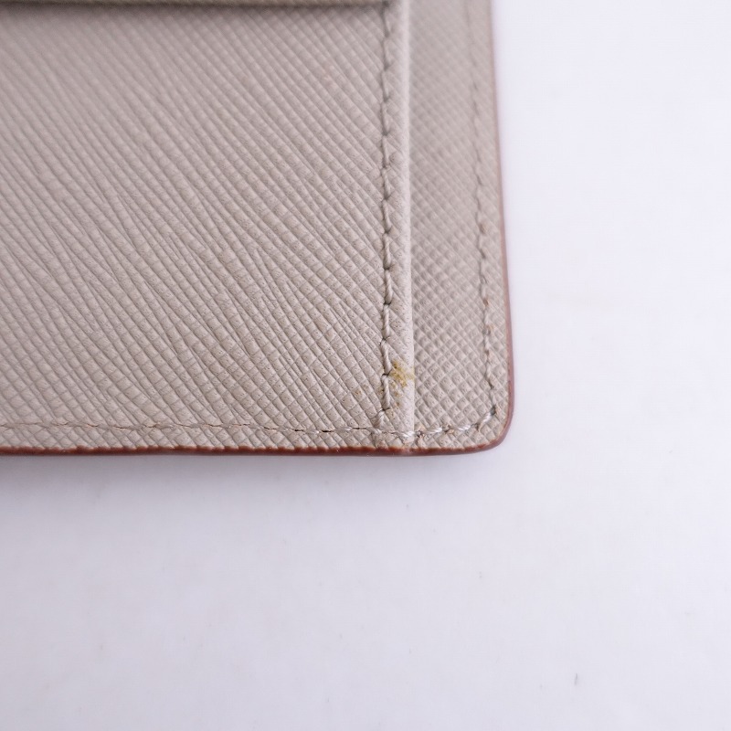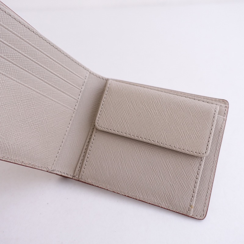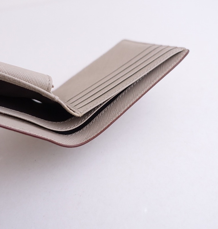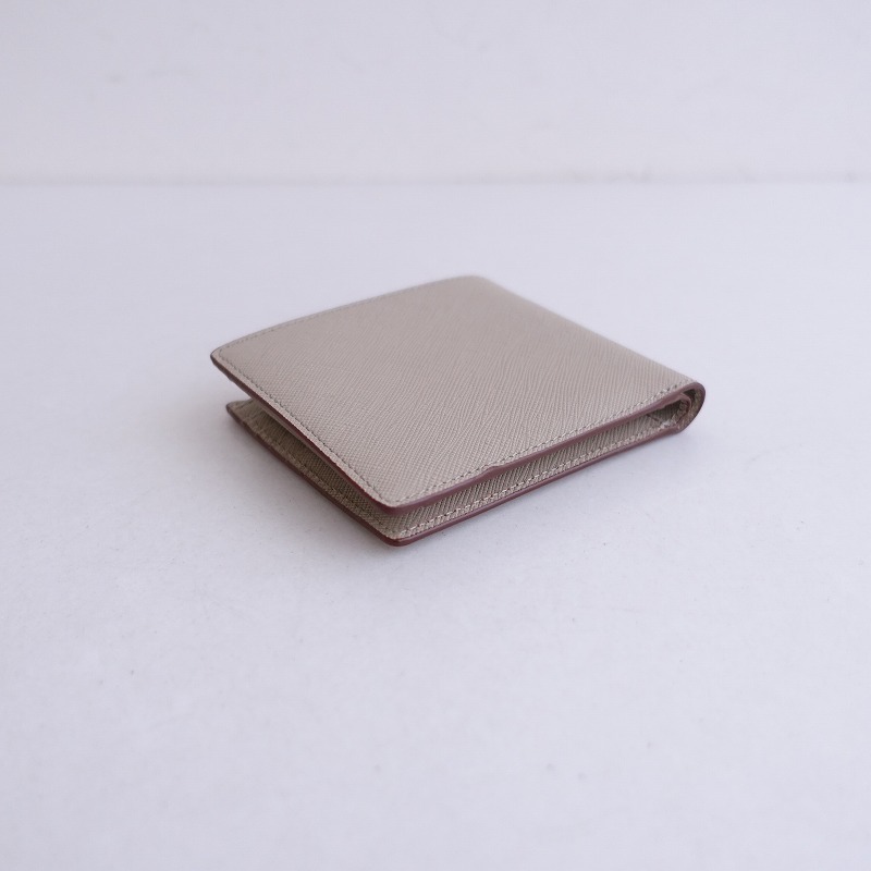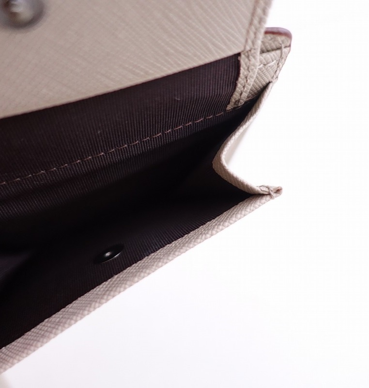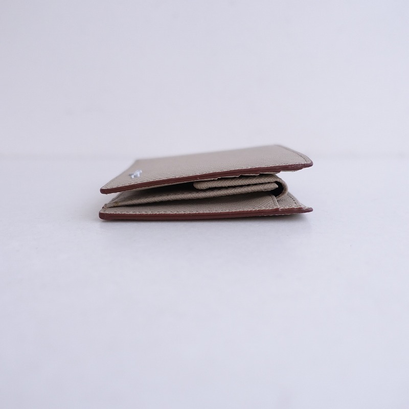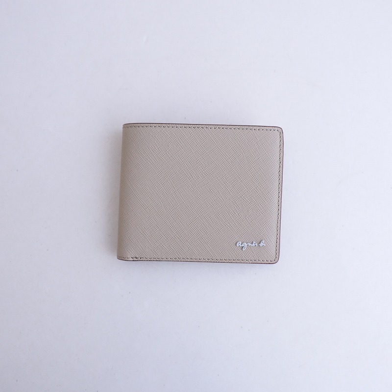agnes b.の二つ折り財布です。 カラーはベージュでレザー素材です。二つ折りでスナップボタン開閉の小銭入れ×1、カード入れ×5、お札入れ×2ございます。ロゴのみのシンプルなデザインはベーシックでタイムレスなアイテムです。 |