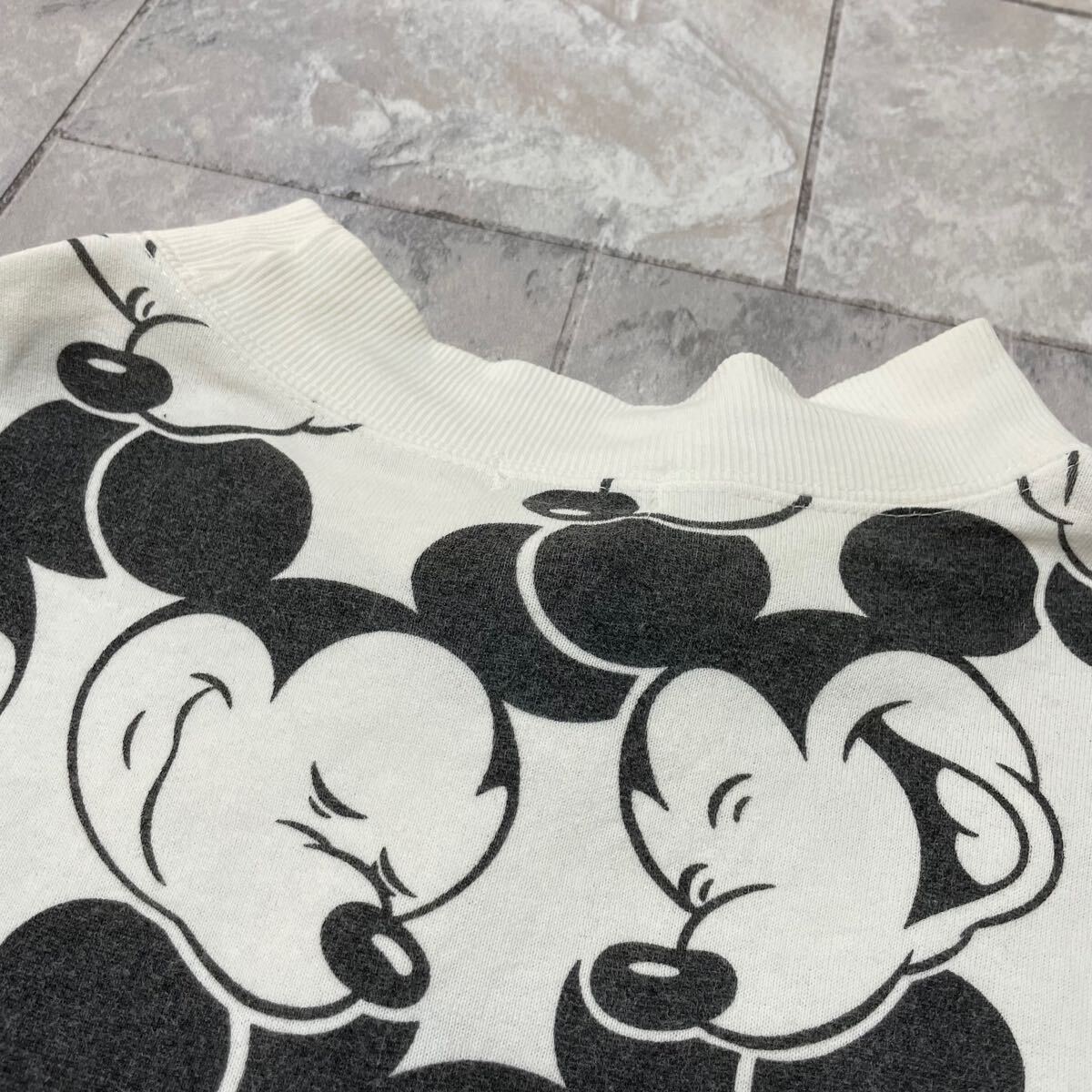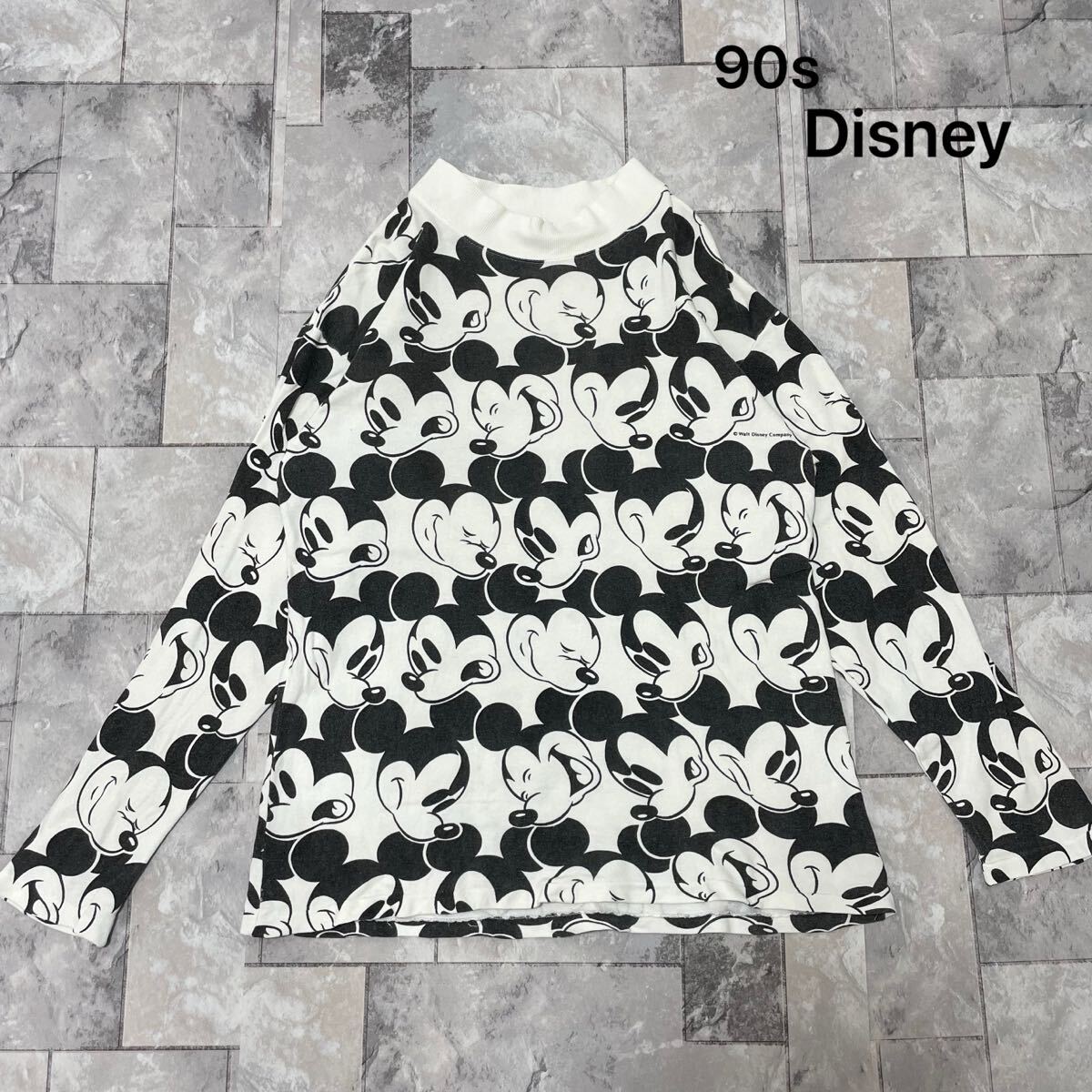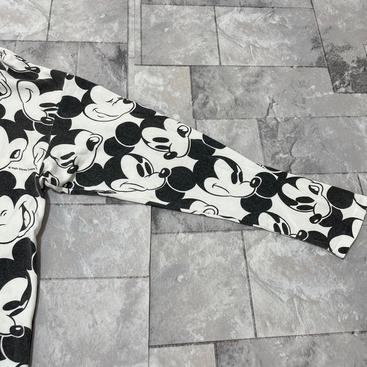 90s Disney ディズニー Mickey ミッキーマウス ロンT Tシャツ 長袖 総柄 モックネック 日本製 サイズL相当 ホワイト 玉FL3877