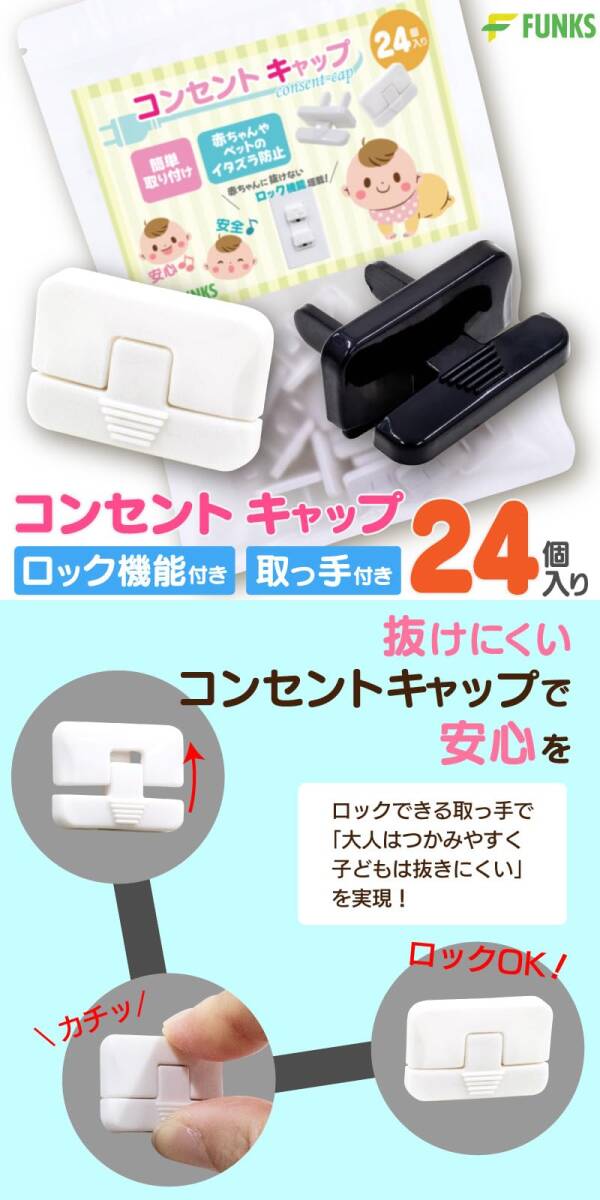FUNKS 抜けにくい コンセントキャップ 黒 ロック付き 24個セット コンセントカバー 赤ちゃん 取っ手 ロック付き コンセントガード (ブラック)