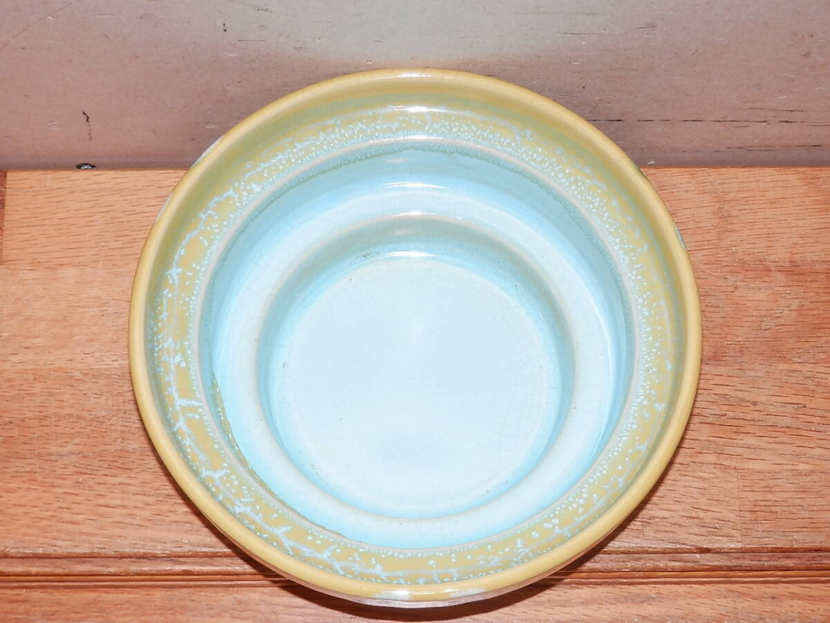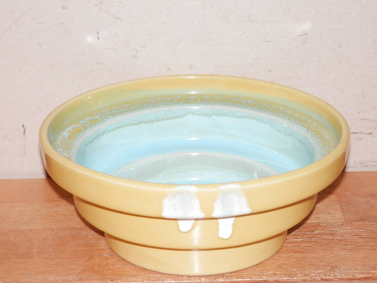 陶器の花生け 直径18.6cm 無銘 黄色/水色(検索 華道具花瓶花器盆栽鉢池坊