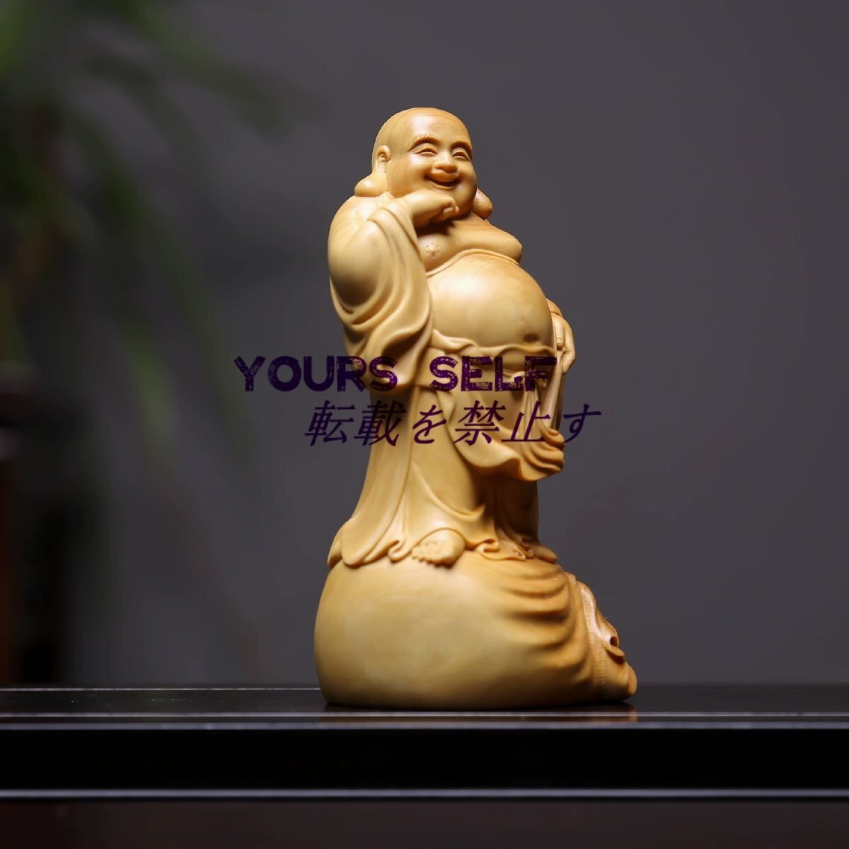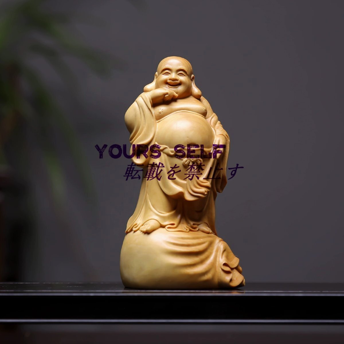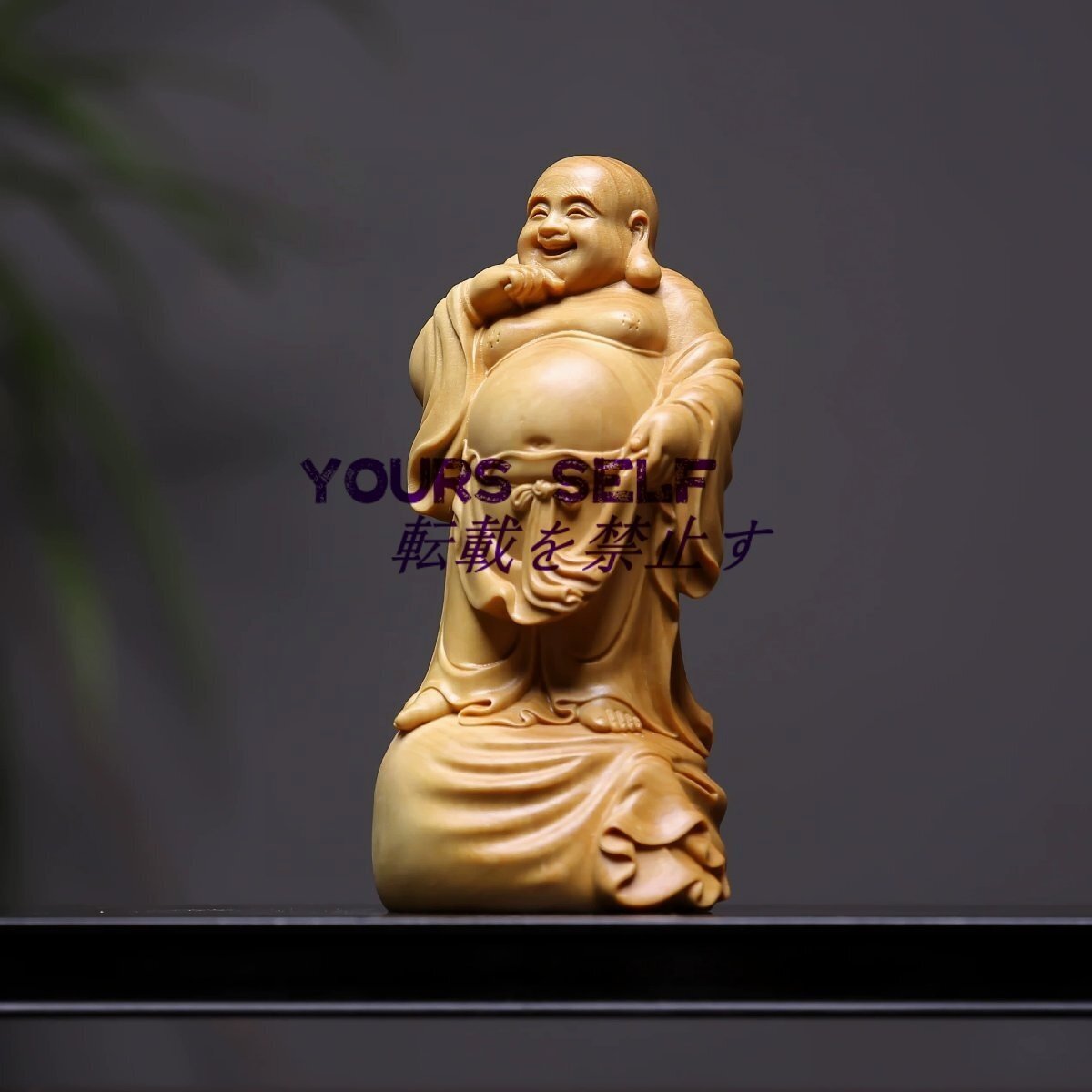 木製布袋様 笑門来福 布袋像 高級天然ツゲ木彫り <仏像・開運縁起物・幸運置物> 布袋様の置物 七福神 置物(高さ12cm×巾6cm×奥行5cm)
