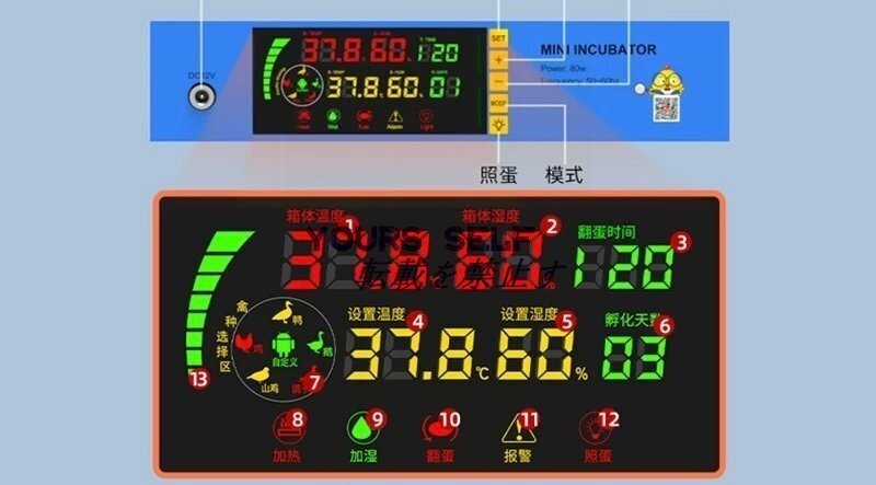 【LEDディスプレイ】操作が簡単で、温度、湿度、孵卵、卵の回転時間などの重要な情報を表示するLEDディスプレイで温度を設定できます。温度管理により、卵が理想的な環境にあることを確認できます。孵卵器は照卵ライトが搭載され、孵化中に全ての卵の発育状況を容易に確認でき、孵化のプロセスもよく観察できます。