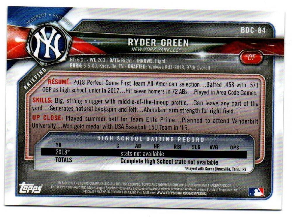 【RYDER GREEN(New York Yankees)】2018 BOWMAN Chrome Draft Green Refractors #BDC84[44/99]