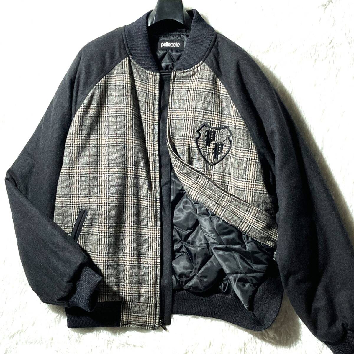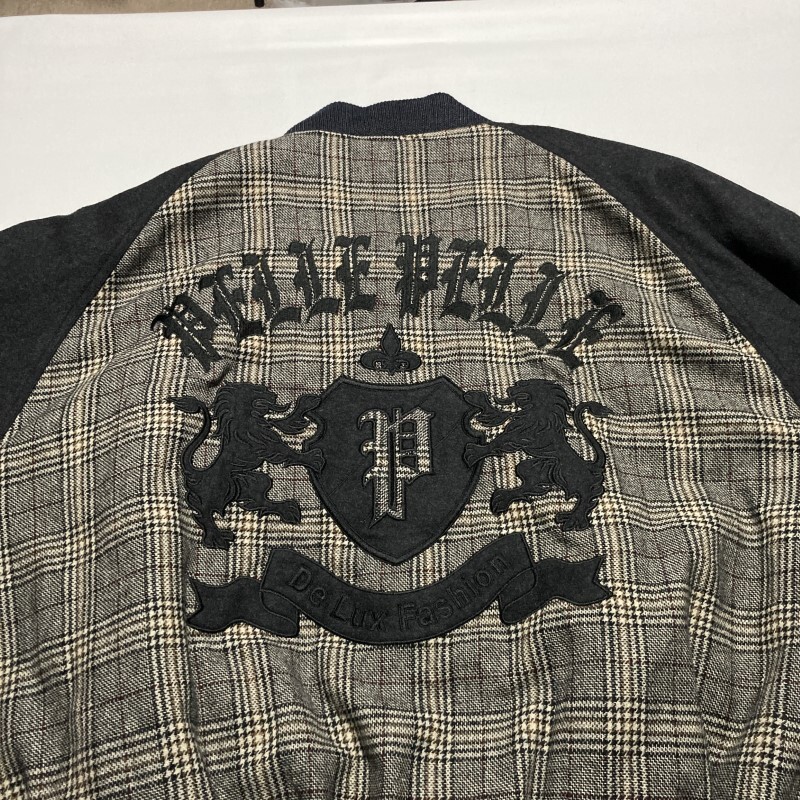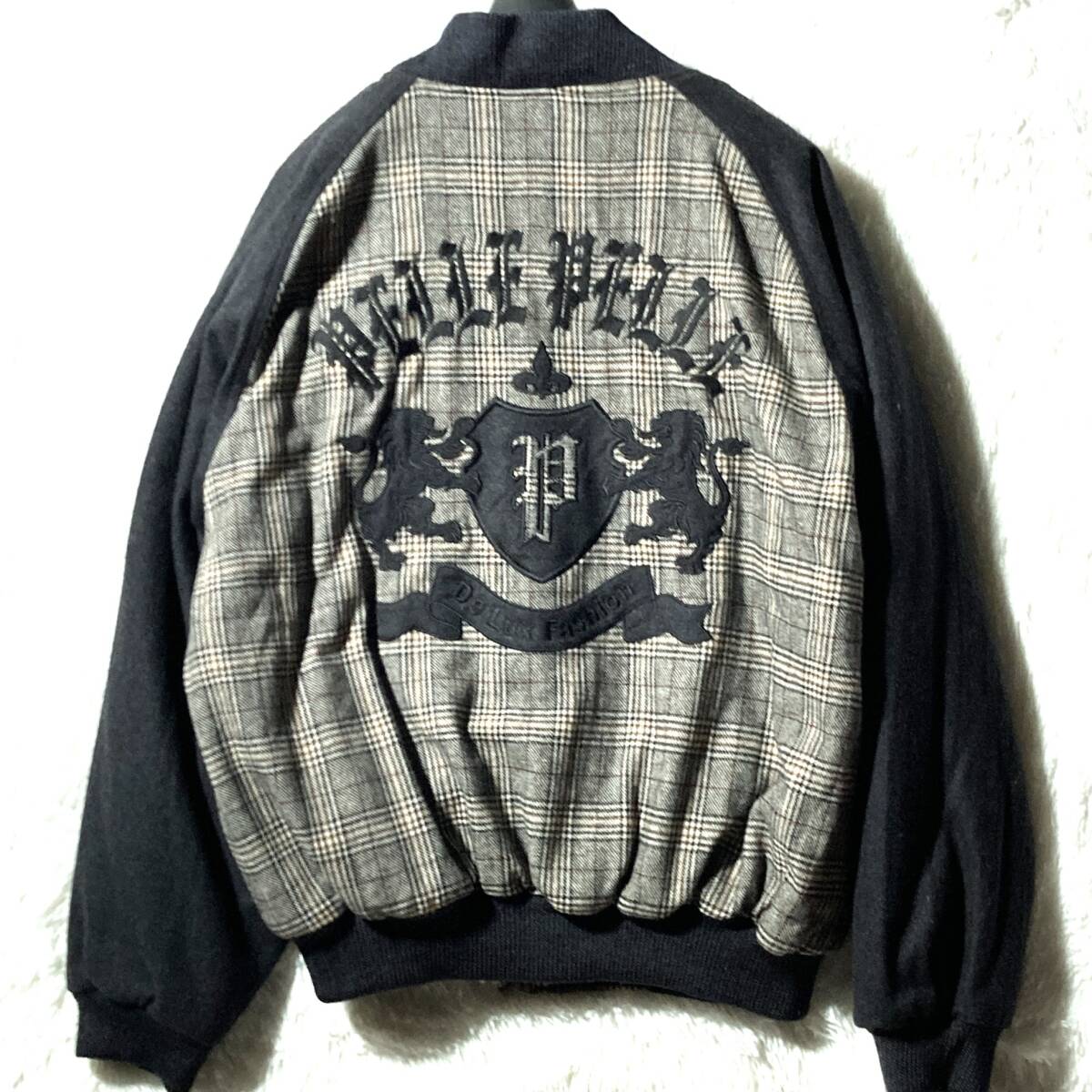pelle pelle★豪華インパクト★ロゴ&ライオン&エンブレム刺繍 中綿スタジャン グレンチェック&格子チェック 灰 大きいサイズXXL ペレペレ