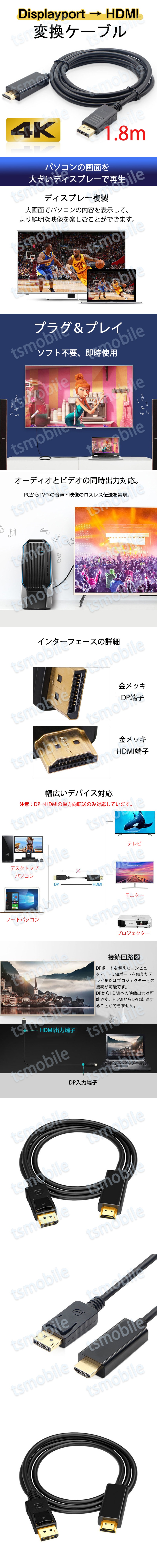 | Displayportオス to HDMIオス変換ケーブル 長さ:1.8メートルパソコンとモニター、ディスプレイ、プロジェクター、テレビーなどの接続に使われます。ディスプレー複製。大画面でパソコンの内容を表示して、より鮮明な映像を楽しむことができます。プラグ&プレイで、HDの大画面を楽しむことができます。ソフト不要、即時使用。オーディオとビデオの同時出力対応。PCからTVへの音声・映像のロスレス伝送を実現。太い導線で転送スピードが速い、断線しにくい、耐久性と安定性が評価されています。注意:DP→HDMIの単方向転送のみ対応しています。 |