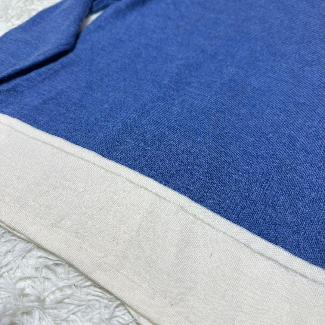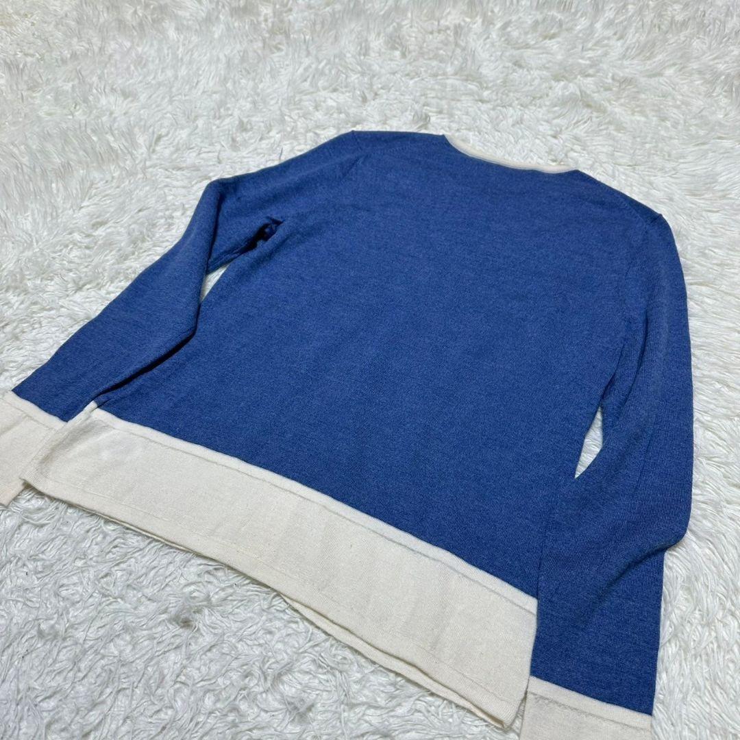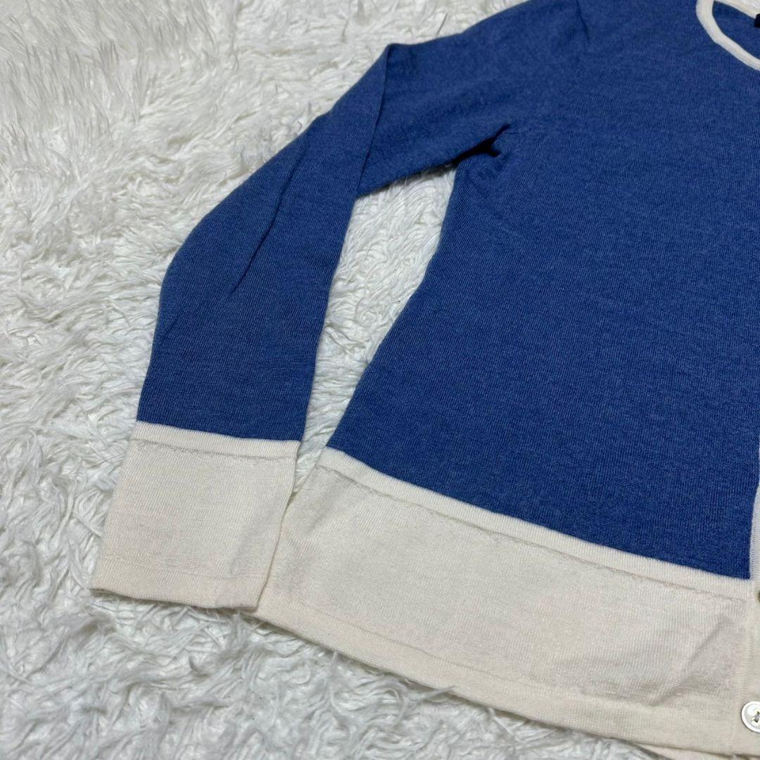 青とクリームのボタン付き長袖カーディガン、ニット素材で快適。