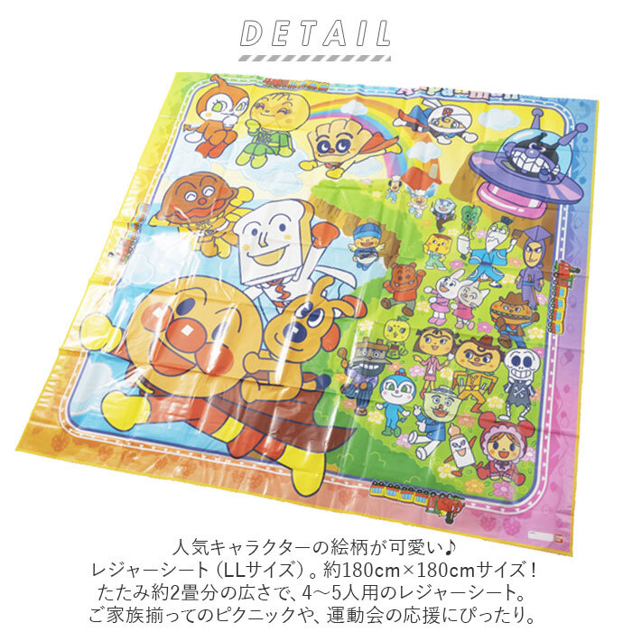 商品説明 | ・・人気キャラクターの絵柄が可愛い♪レジャーシート(LLサイズ)。 ・約180cm×180cmサイズ!たたみ約2畳分の広さで、4~5人用のレジャーシート。 ・ご家族揃ってのピクニックや、運動会の応援にぴったり。 ・水や汚れに強いポリエチレン・ポリプロピレン製。汚れても水洗いできるから、お手入れがラクチン。 ・お気に入りのキャラクターたちが、気分を盛り上げてくれること間違いなし♪ |