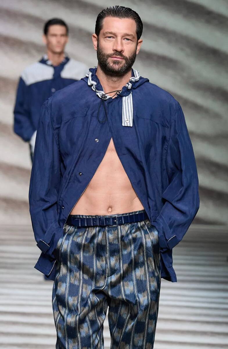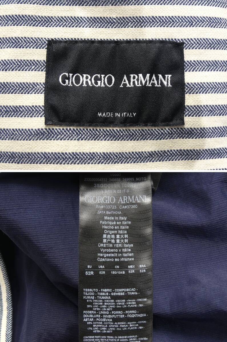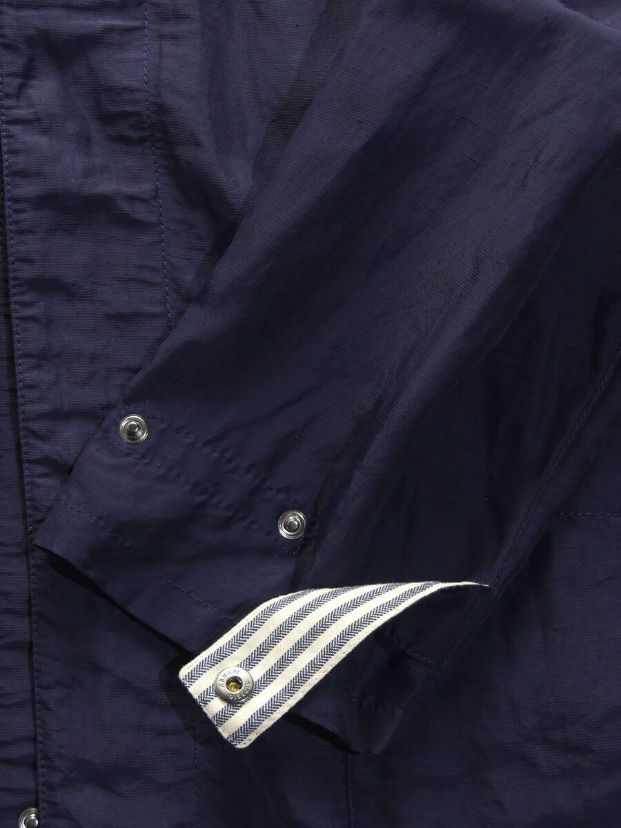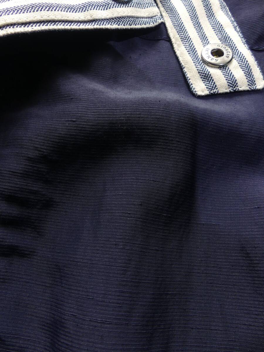 こちらはかなり薄手で軽量の清涼ジャケットです。最高峰ジョルジオの春夏ランウェイにも登場した貴重なコレクションピース。マウンテンパーカーのようなフィールド風カジュアルスタイル。清涼感のある紺色に、随所に施された白×紺ストライプのリボンがアクセント。キメ感が出すぎずに、ゆるくラフに着流せる感じが今の時代にぴったりのアウターと思います。方向性があまり無いタイプのジャケットですので合わせるパンツや靴をほとんど選びません。スニーカーとジーンズでも、革靴にスラックスでも、まず大抵は何でもコーディネイト出来ちゃいます。自分なりの着こなしアレンジをお楽しみください。着用時期は4月からになると思います。7月8月はさすがに無理ですが、10月まで使える春夏秋向けのアウターになります。