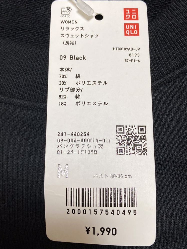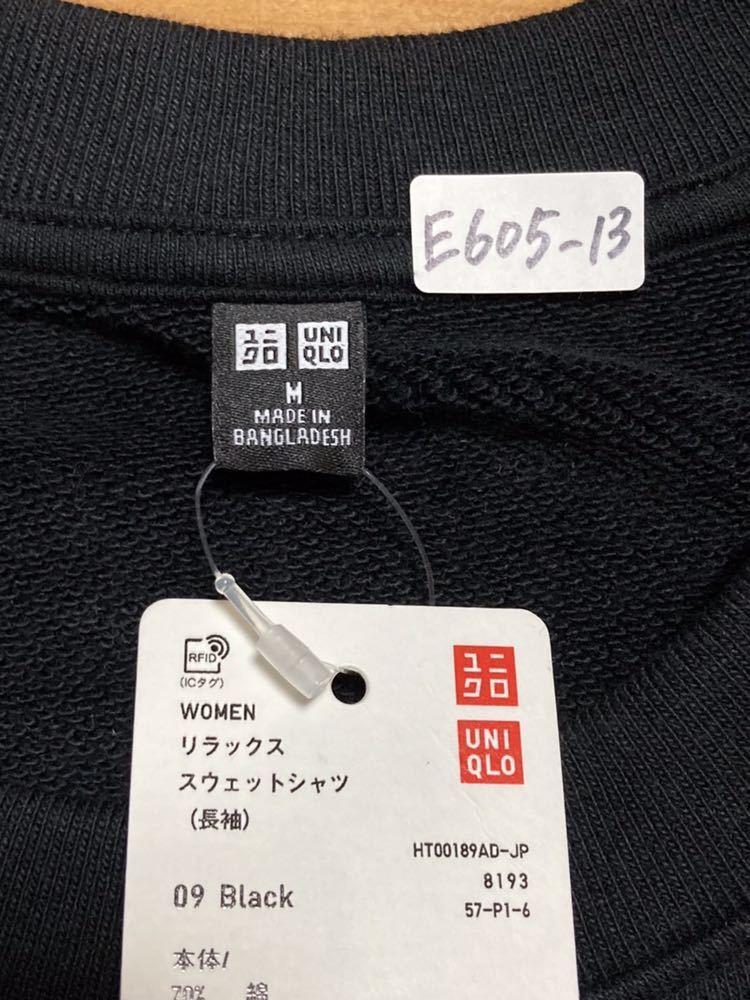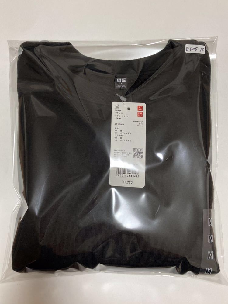 未使用 ★ UNIQLO ユニクロ リラックス スウェットシャツ 長袖 レディース 黒 ブラック M ★ E605。サイズ約59×60×50センチ。