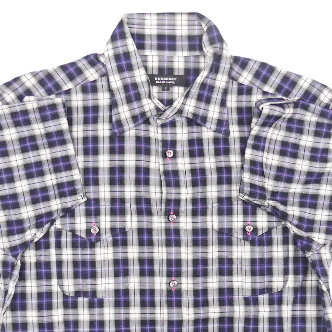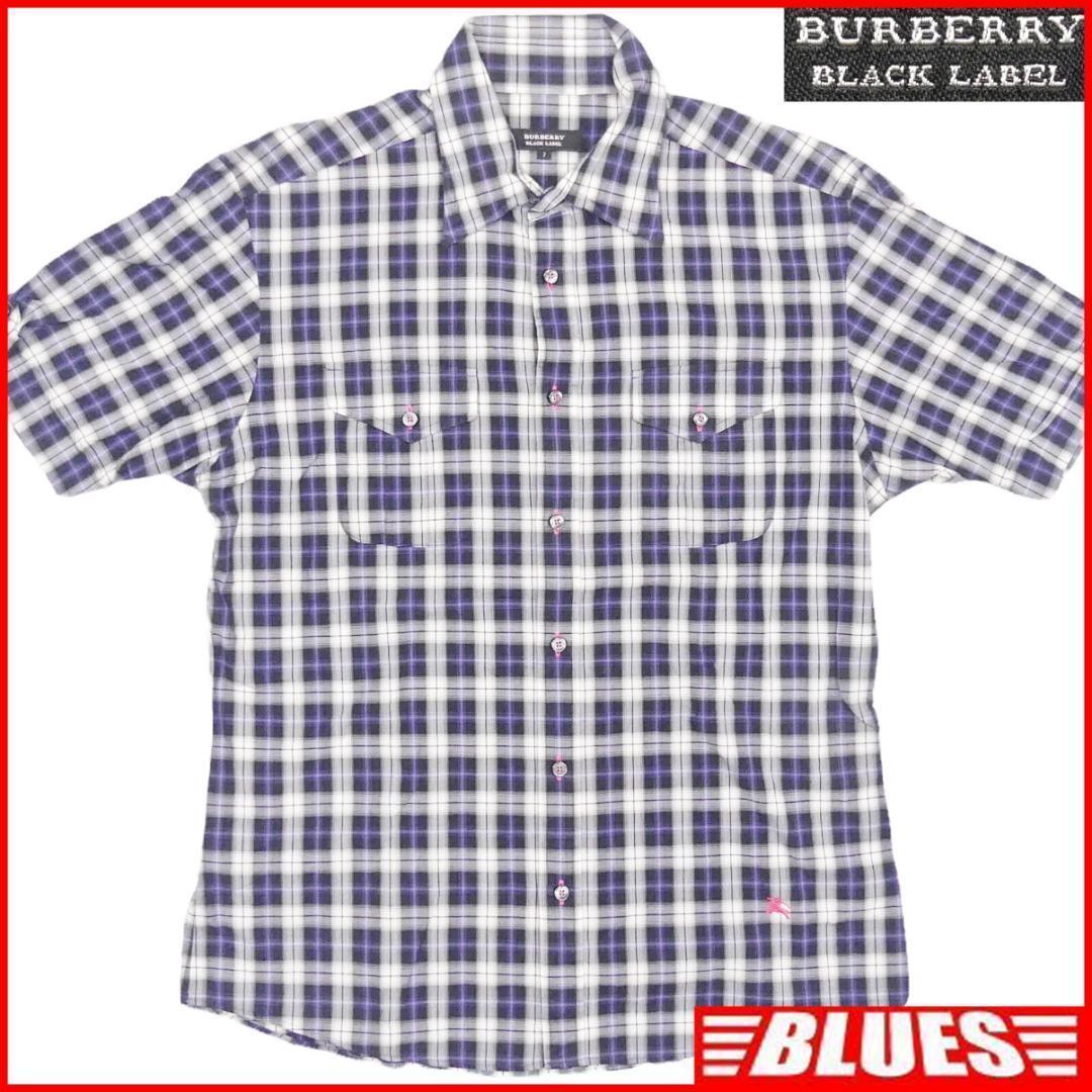 即決★BURBERRY BLACK LABEL★メンズM 廃版 チェック シャツ バーバリーブラックレーベル 2 黒 紫 三陽商会正規 ナイト刺繍 半袖