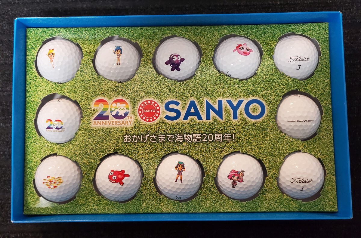 キャラクター付きのSANYOオリジナルゴルフボール12個セット、20周年記念デザイン。