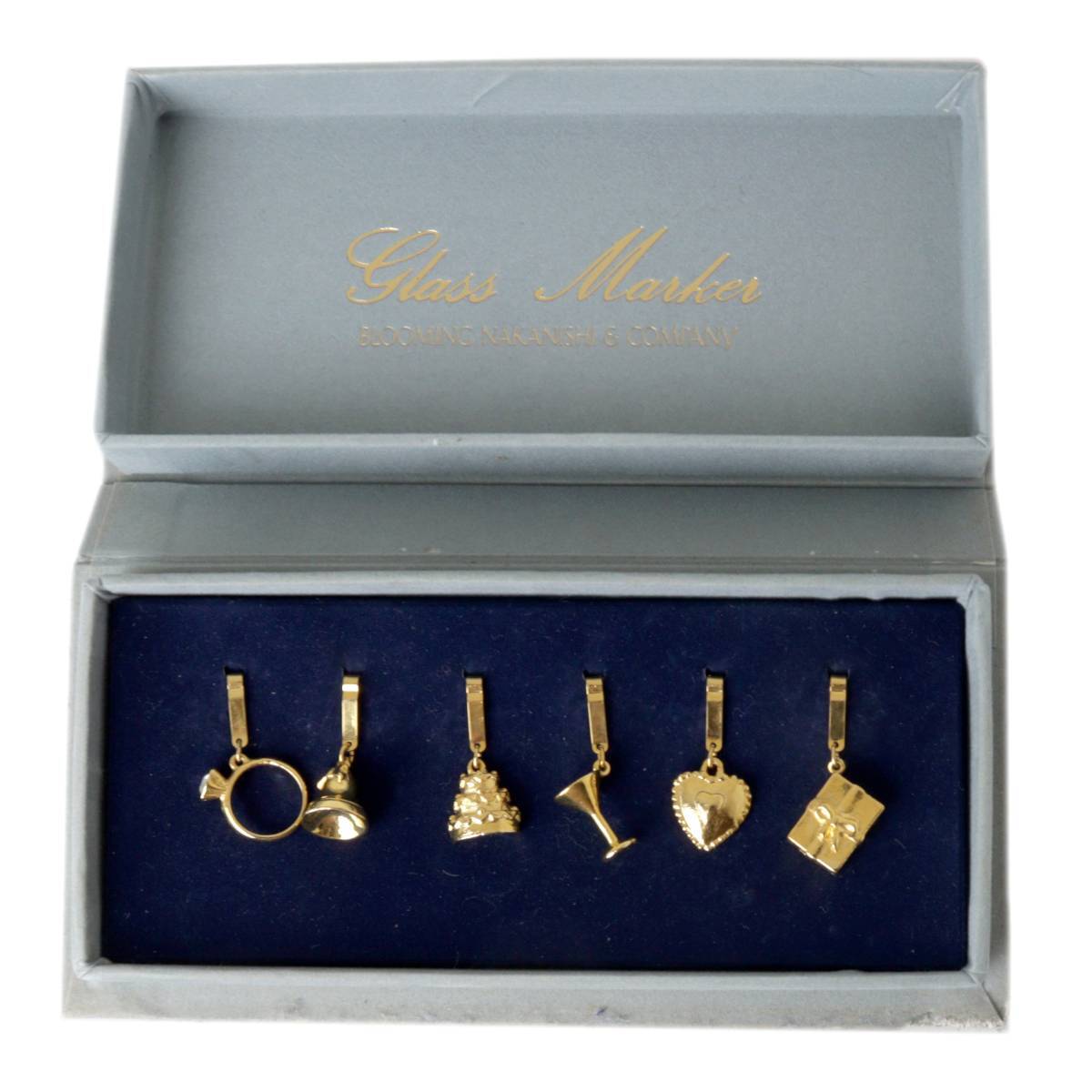 【担当より一言】 | ブルーミング中西のTable Talk Glass Markerは、エレガントなデザインが特徴のグラスマーカーセットです。ハートやベル、指輪、プレゼント、ケーキの形をした6つのマーカーが含まれており、パーティーや特別な集まりでのグラスの識別に最適です。ゴールドの輝きがテーブルを華やかに演出し、ゲストに特別な印象を与えます。全長約3.2~4cmのコンパクトなサイズで、持ち運びにも便利です。 |