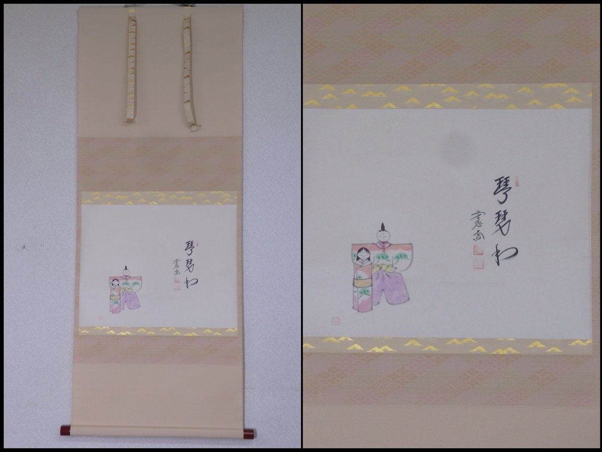 ★前大徳 極楽禅寺 西垣大道和尚【掛軸『雛画賛』琴瑟和 共箱】紙本 肉筆 彩色 幅45.3×全長116.2cm ひな人形 桃の節句 3月 茶道具