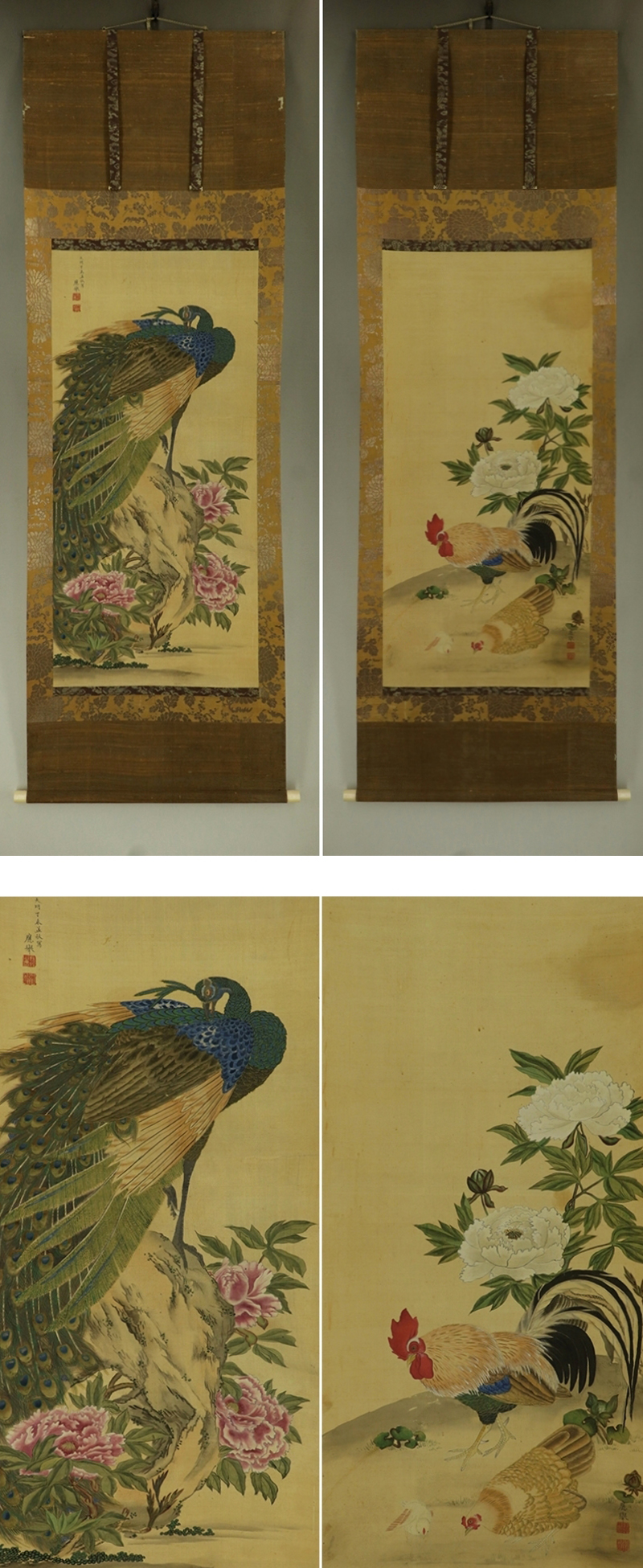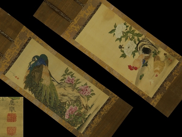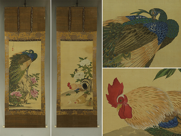 | №2412015【模写】円山応挙【双幅・牡丹孔雀鶏】◆絹本◆合箱◆掛軸 | |