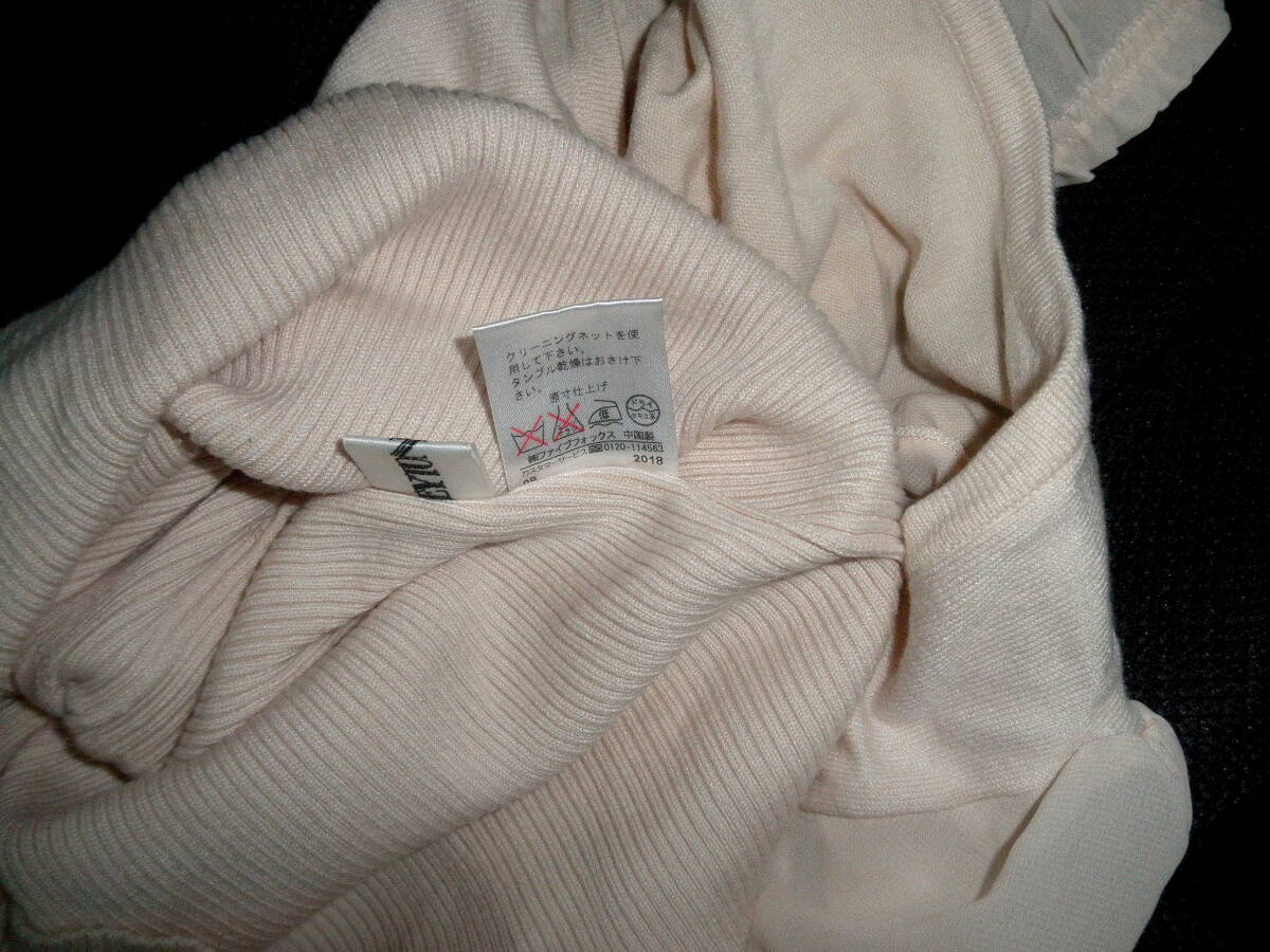 ・薄いベージュピンクで伸縮性あり。袖はシフォンなので透け感あります。とても上品でチクチクしない春夏ニット。