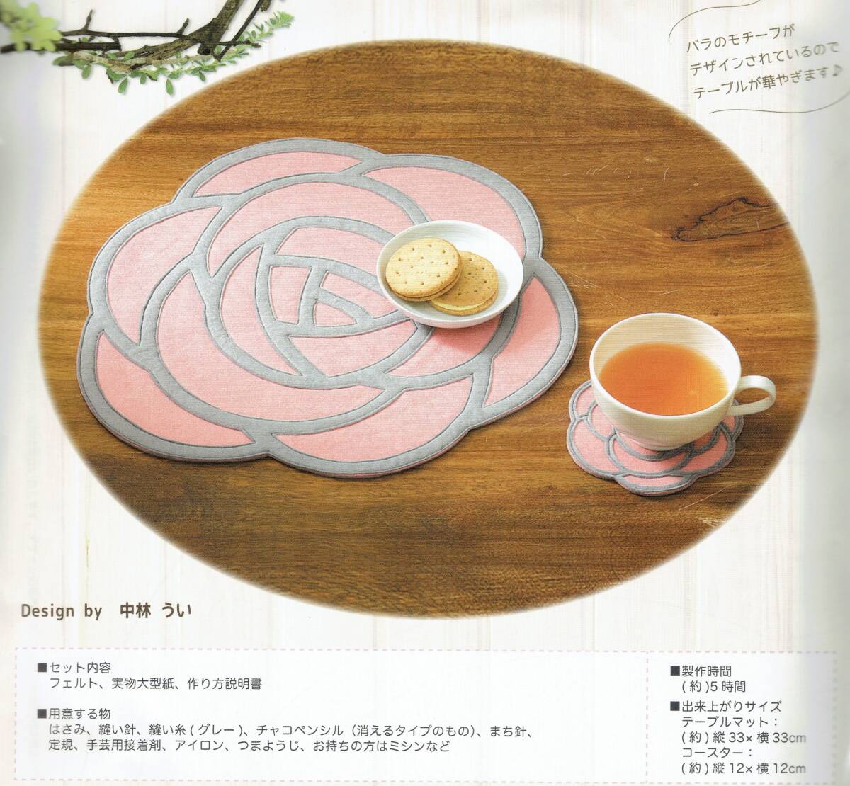・バラのテーブルマット&コースター:約縦33×横33cm/約縦12×横12cm