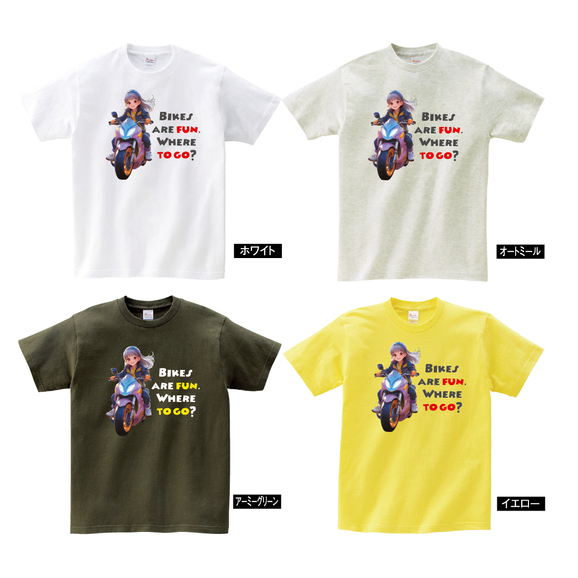このTシャツは、バイクを愛するすべての方々におすすめのアイテムです。鮮やかな色合いの中に、バイクに乗る美少女アニメキャラクターがデザインされており、そのキャッチーなビジュアルが目を引きます。スローガン「Bikes are fun. Where to go?」は、冒険心をくすぐるメッセージを投げかけ、バイク乗りの自由な精神を象徴しています。厚手で耐久性のある綿100%素材を使用しており、快適な着心地と共に長持ちする品質を保証します。豊富なカラーバリエーションがあり、お好みやスタイルに合わせて選べる12色展開は、多様なファッションニーズに応えます。バイクツーリングの際のカジュアルウェアとしてはもちろん、日常使いにも適しており、どんなシーンでもその個性を放つことができます。バイク愛好家へのプレゼントとしても最適で、受け取った方を確実に喜ばせることでしょう。
