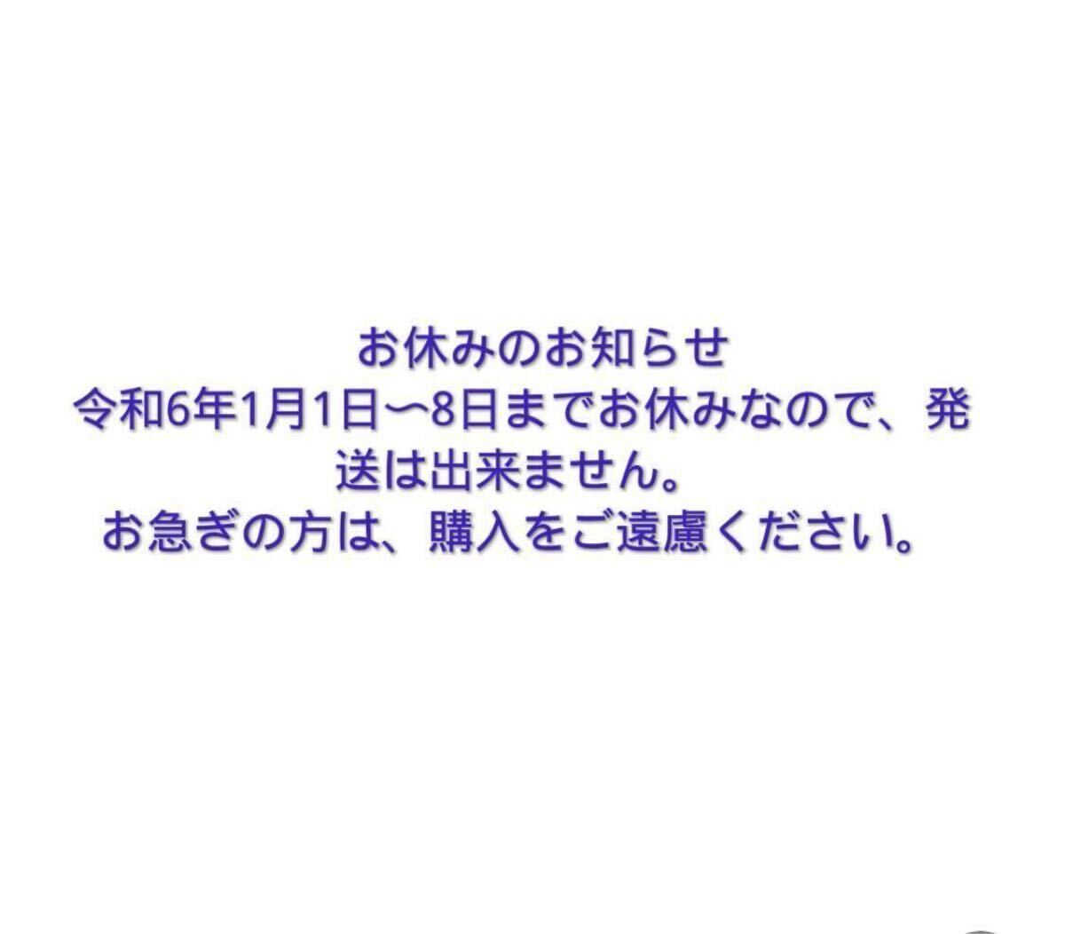 令和6年1月1日〜8日までお休みなので、発送は出来ません。お急ぎの方は、購入をご遠慮ください。