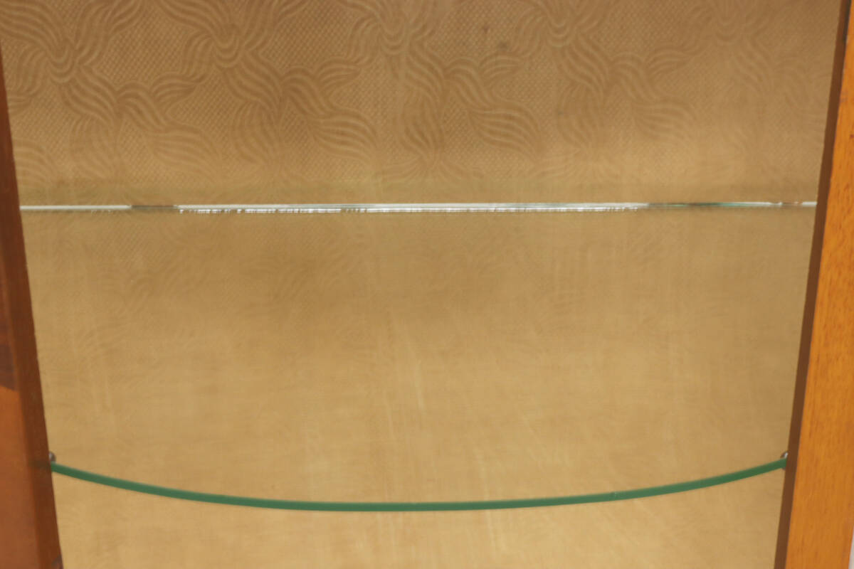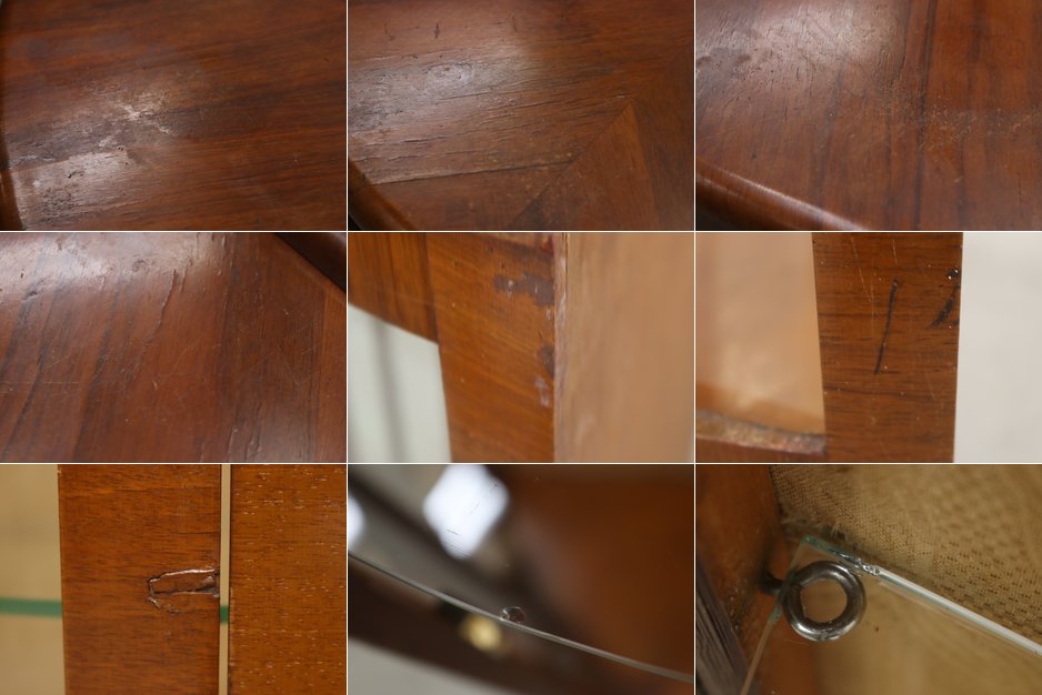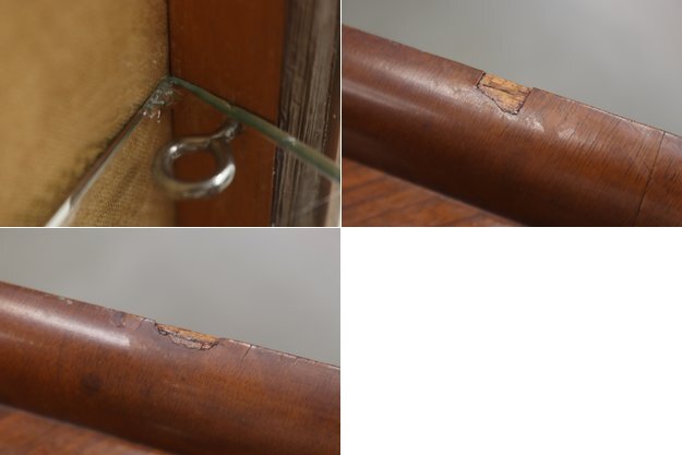 全体的に傷や擦れ、塗装の剥がれ、ガラスの棚板に小さな欠けがありますが使用に差し支える様な