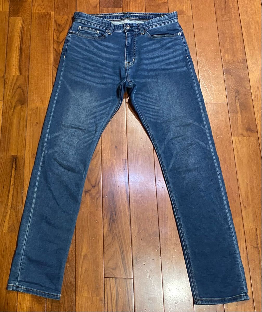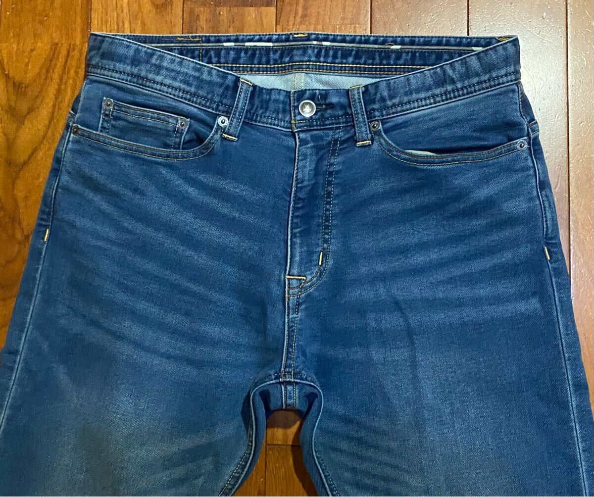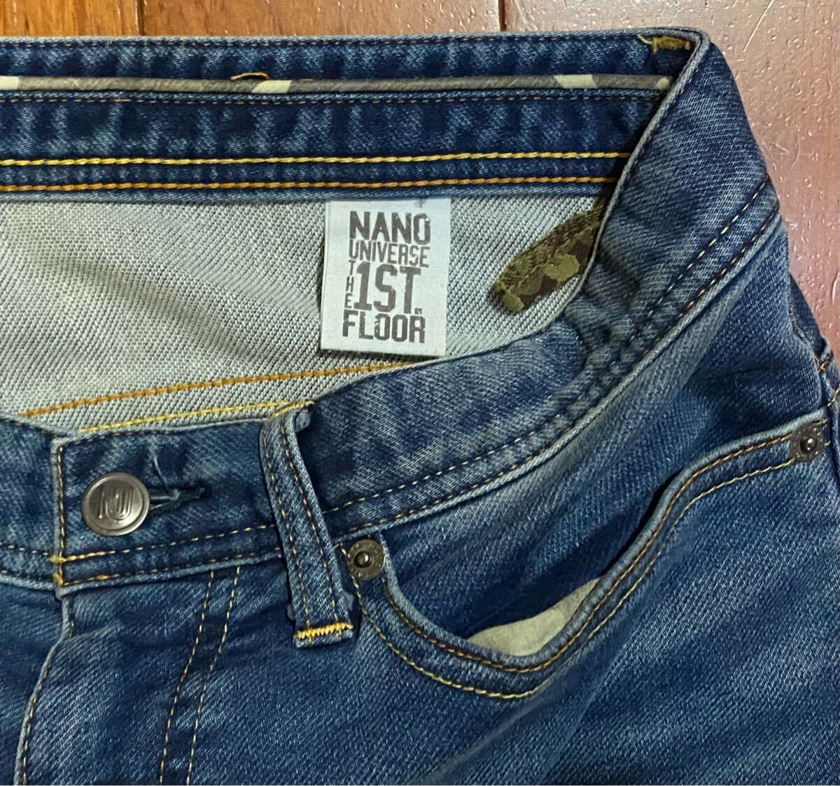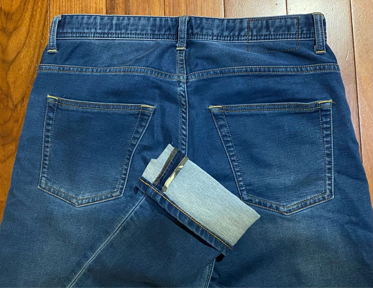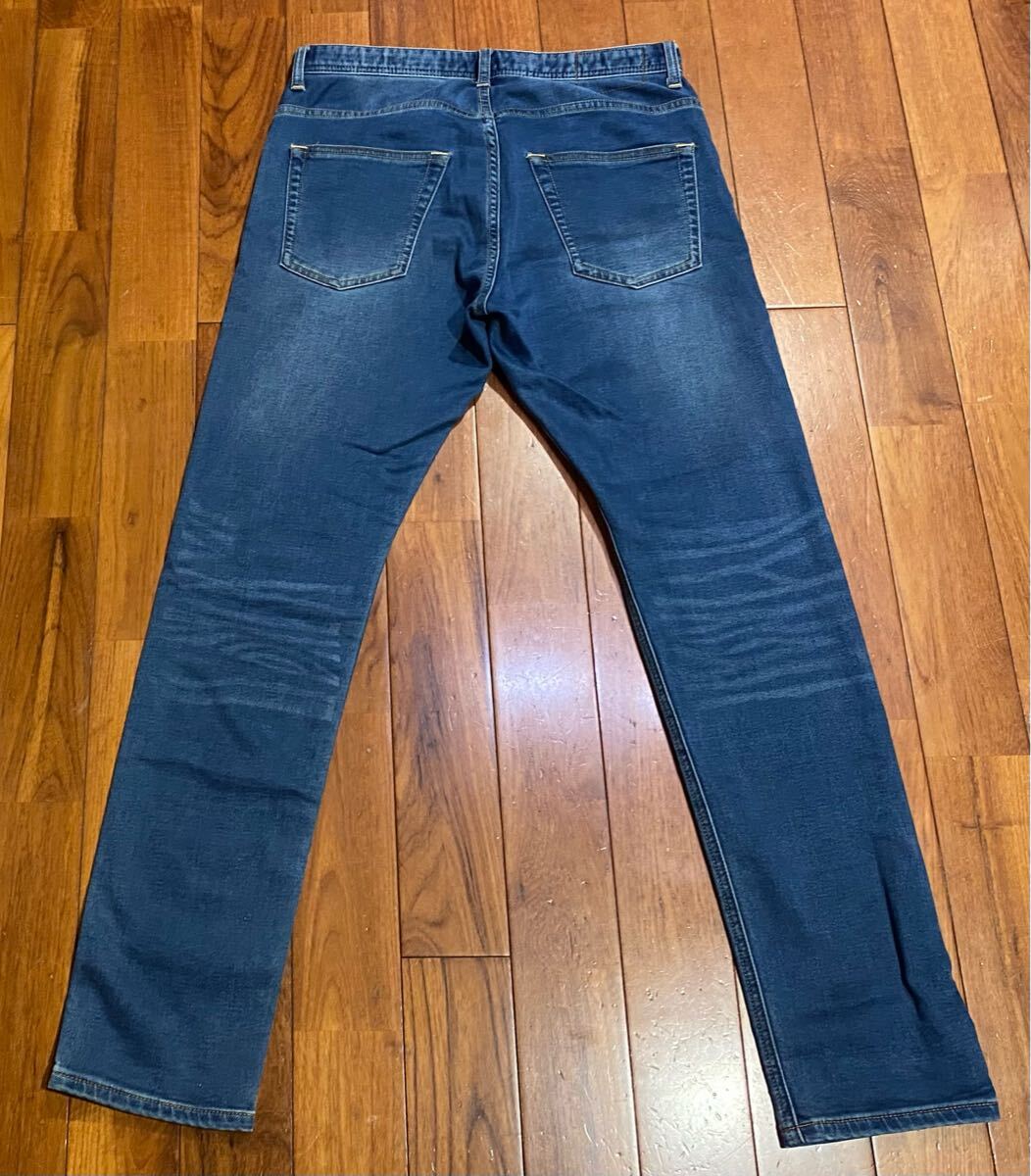 ナノユニバースのスウェットデニムパンツ、NUF62LP0357GKです。色はインディゴブルーです。USEDですが状態は良いです(10段階中8程度)。生地はストレッチ入りで綿77%、ポリエステル17%、レーヨン5%、ポリウレタン1%です。ジッパーフライ、裾はチェーンステッチです。正規品です((株)ナノ・ユニバース、中国製)。サイズはMでウエストは重ねずに平置きで約81cm、ヒップ約106cm、股上約28cm、股下約81cm、股下15cmのふともも部分約52cm、裾まわり約34cm、重量約520gです。発送はゆうパケットポストになります。