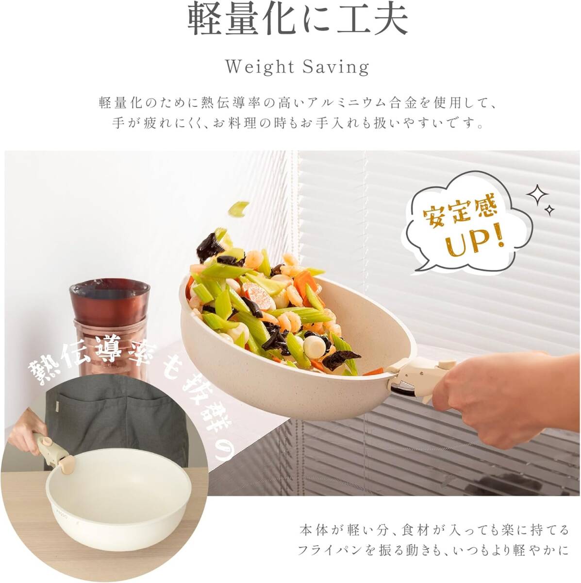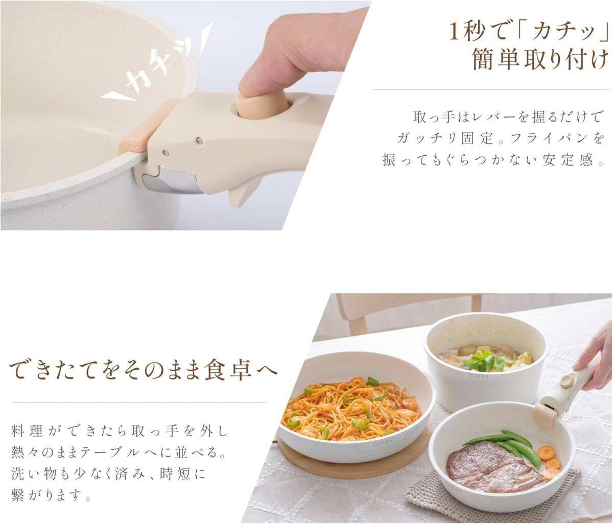• 【取り外し可能な取っ手】必要なときだけ取り付け、使わない時は簡単に取り外せるこの取っ手は、使い勝手を大幅に向上させます。レバーを握るだけでしっかりと固定されるため、フライパンを振っても安定感があり、ぐらつきません。料理が完成したら、取っ手を外してそのまま熱々の料理をテーブルに並べることができます。取っ手が取り外せるので、洗い物も減り、キッチン作業の時間短縮にも繋がります。