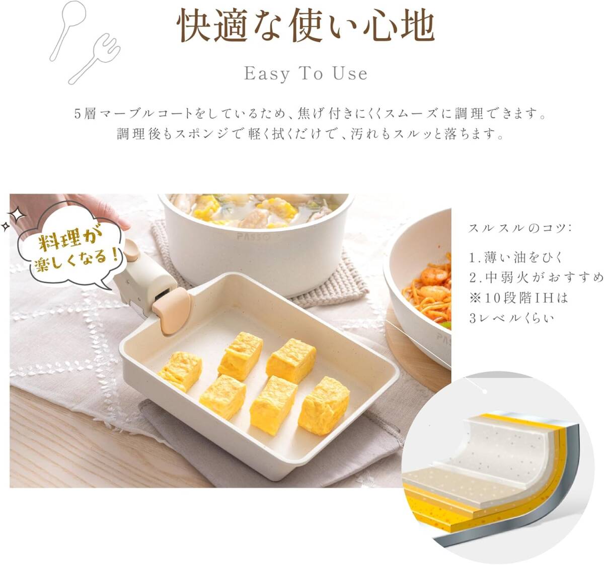 • 【快適な調理体験】当社の5層マーブルコーティング技術により、焦げ付きにくく、スムーズな調理が可能です。調理後はスポンジで軽く拭くだけで、汚れが簡単に落ちます。食材のくっつきにくさは特に卵焼きにおいて顕著で、すばやく綺麗に剥がれ、快適な手回しを実現します。また、軽量なアルミニウム合金を使用しているため、熱伝導率が高く、長時間の使用でも手が疲れにくいです。本体が軽いため、食材を入れても片手で簡単に持ち運べ、フライパンを振る動作も軽快に行えます。
