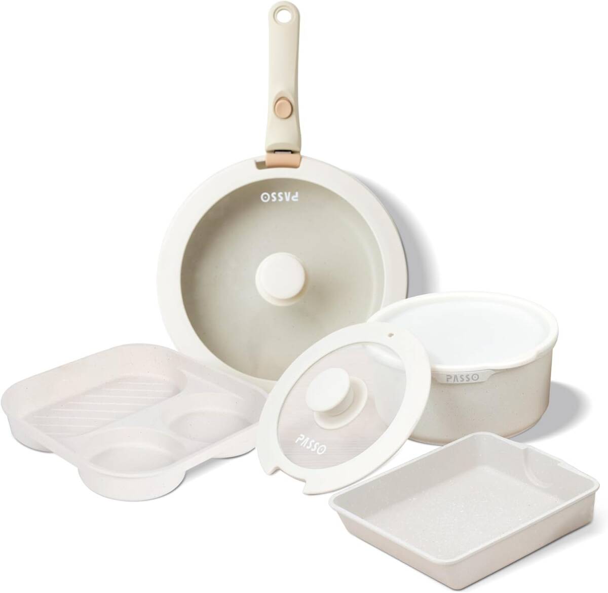 フライパン セット 8点 IH対応 ガス対応 鍋セット 取っ手のとれる 3in1 3つ穴円形フライパン卵焼き器 ソースパン 蓋付き passo-002-set8