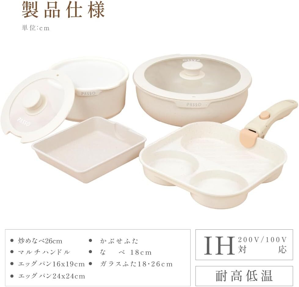• 【セット内容】 エッグパン幅16×19cm重量:300g満水容量:1.2L / エッグパン幅24×24cm重量:450g / 炒めなべ 直径:26cm 重量:約630g 満水容量:4.2L / なべ直径:18cm重量:380g 満水容量:2.2L / ガラスふた直径:18cm重量:336g / ガラスふた直径:26cm:重量500g / マルチハンドル重量:200g(1個あたり) 材質:表面加工:コーティング加工(フッ素・マーブル粒子)、本体:アルミニウム合金、底面:ステンレス(クラッド鋼板)、取っ手:ベークライト(フェノール樹脂) / かぶせ蓋直径:18cm 材質:ポリエチレン