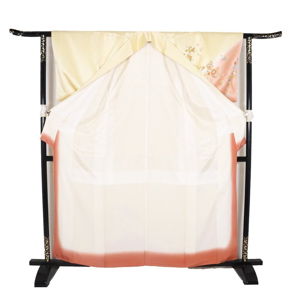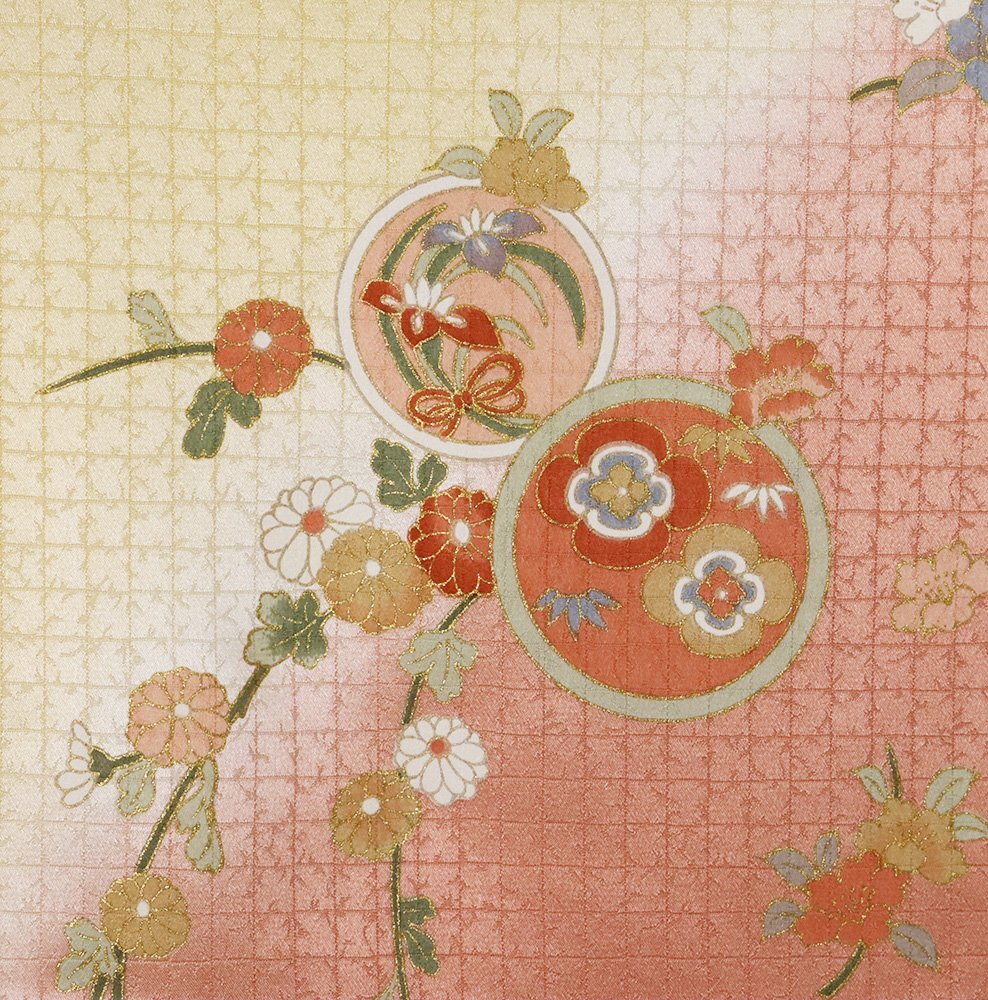 | 訪問着 袷 丹後縮緬地 山吹色(淡黄色)・赤(東雲色)・暈し 小格子綸子地 花丸文 松竹梅・菊・菖蒲 166 広襟 7号(身幅) 仕付け付き | |