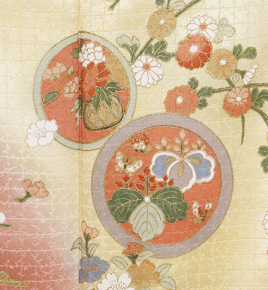 | 色・柄 | 訪問着 袷 丹後縮緬地 山吹色(淡黄色)・赤(東雲色)・暈し 小格子綸子地 花丸文 松竹梅・菊・菖蒲 (写真では上手く色が出ない場合があります。ご了承下さい) |