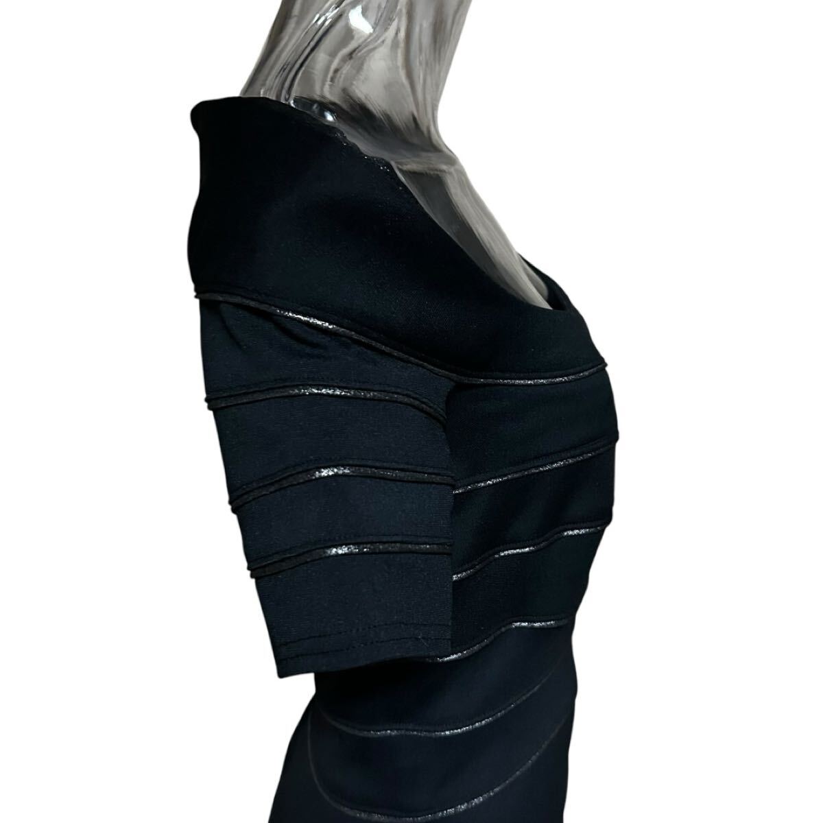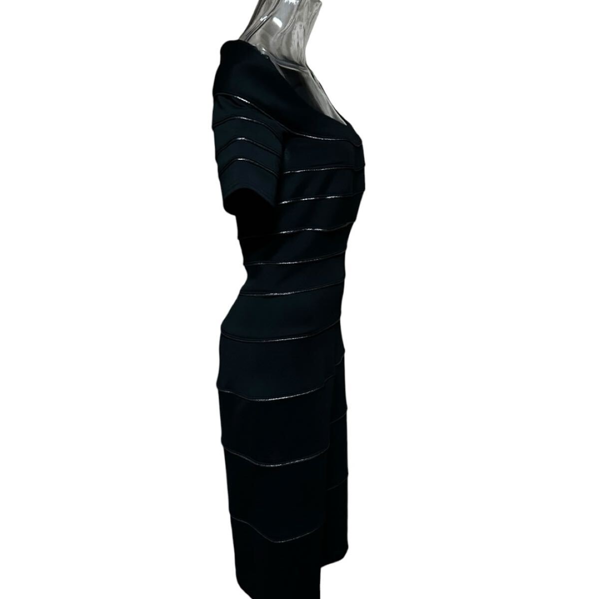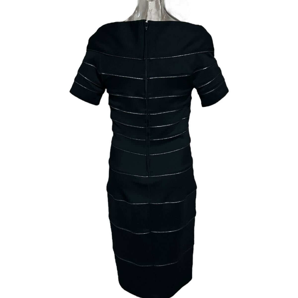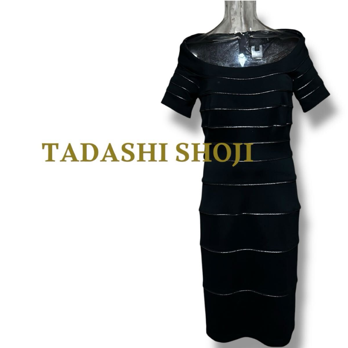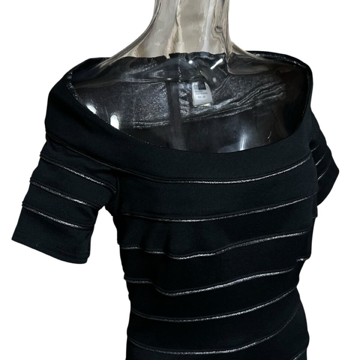 オフショルダーのストライプデザインの黒いひざ丈ワンピース。
