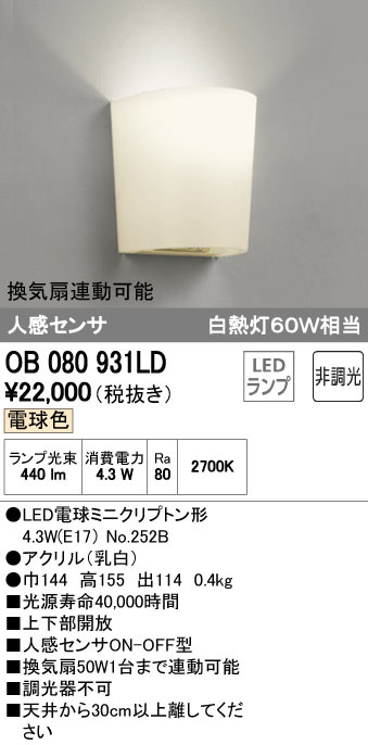 浴室用壁付け照明ライト★人感センサー★LED★換気扇連動可能★照明器具★オーデリック★OB 080 931LD★税込24200→特価9800円【送料無料】
