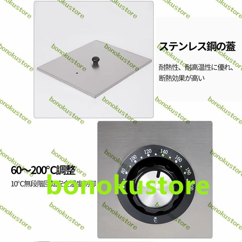 商品の説明商品の説明 ステンレス鋼おでん鍋 電気おでん鍋 業務用デスクトップおでん機スーププール 仕切り付 おでん 電気保温おでん鍋 湯煎式電気おでん鍋 関東煮 多用途おでん鍋業務用 商品:単円筒 9 グリッド/二重円筒 18 グリッド 寸法:29.5x35x26cm/58.5x35x26cm 温度範囲:50-300℃ おでん鍋はステンレス鋼で作られて、耐食技術、火傷防止設計、長時間高温環境で作業しても変形せず、頑丈で耐久性がある。内鍋の材質はステンレス鋼で、耐久性があり、硬度が高く、より良い耐食性・耐摩耗性。 おでん鍋の容量が大きくて、複数人前の料理にも対応できる。 鋳造アルミニウム加熱プレート、通常の加熱パイプより熱伝導がより均一で、より速く、長寿命。 油温は50~300℃の温度範囲で自由に調整でき、さまざまな珍味に対応し、さまざまなスナックのニーズを満たすことができる。 分割式のデザイン、内鍋は洗いやすい。 注意事項と免責事項:本製品は固形油(固形バター、固形ラード、ショートニング、エッジオイル、ホイップクリーム等)の加熱には使用できない。 液体油を添加しないと使用できない。