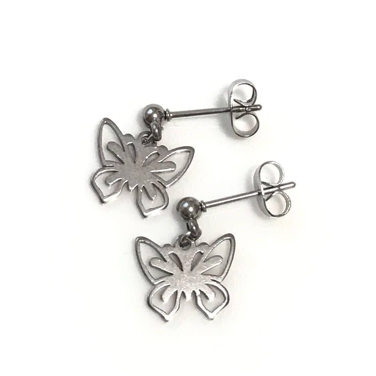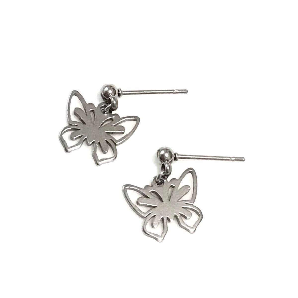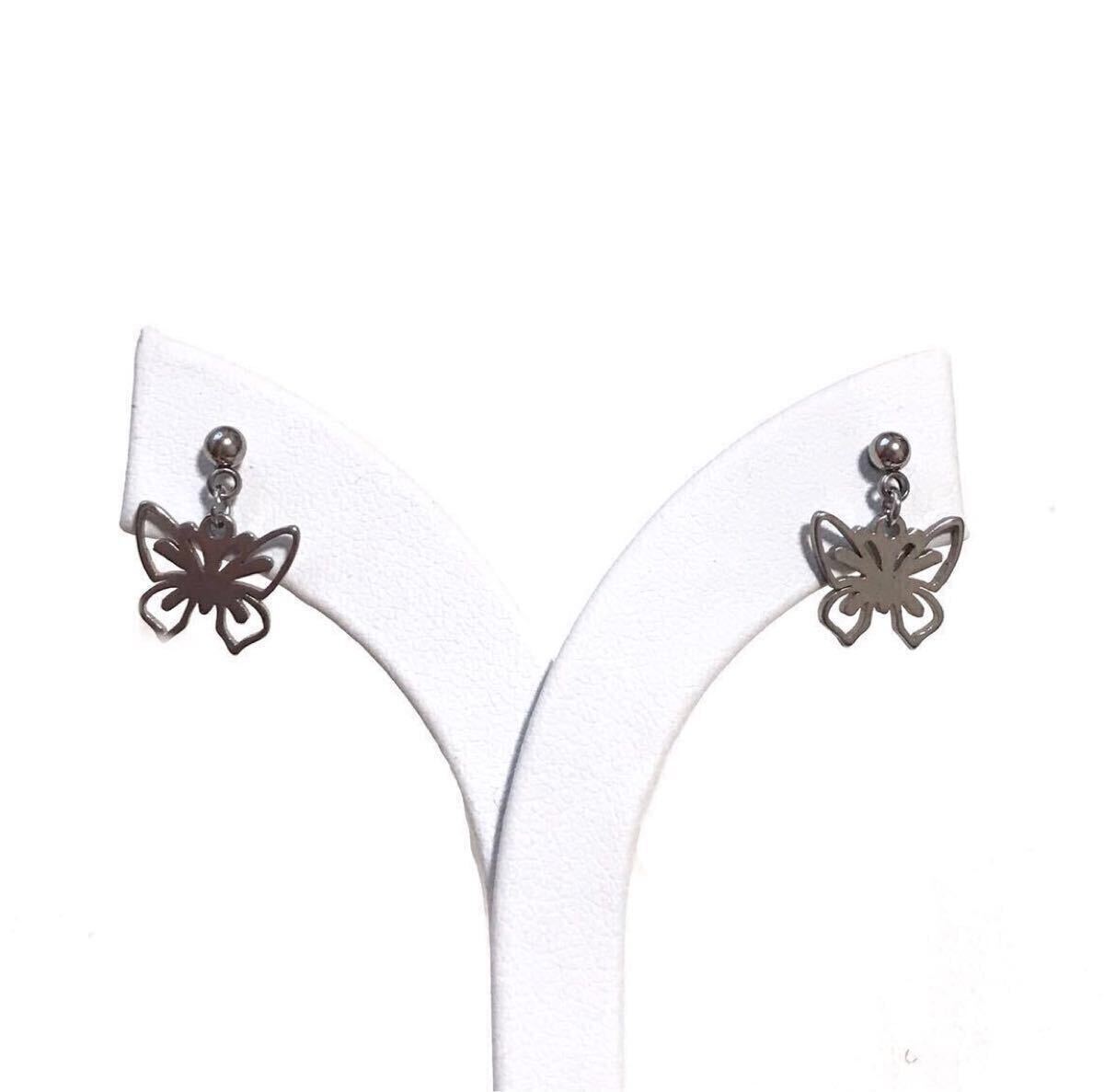 シルバーボールに可愛い蝶のモチーフがついた、サージカルステンレスピアスです。動くたびに揺れるチャームが魅力です。シンプルデザインで、どんなファッションにもよく合うお品です。