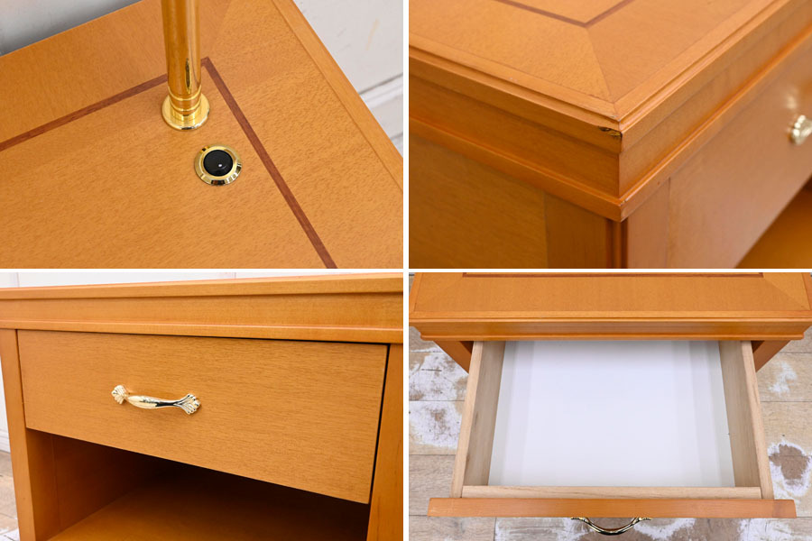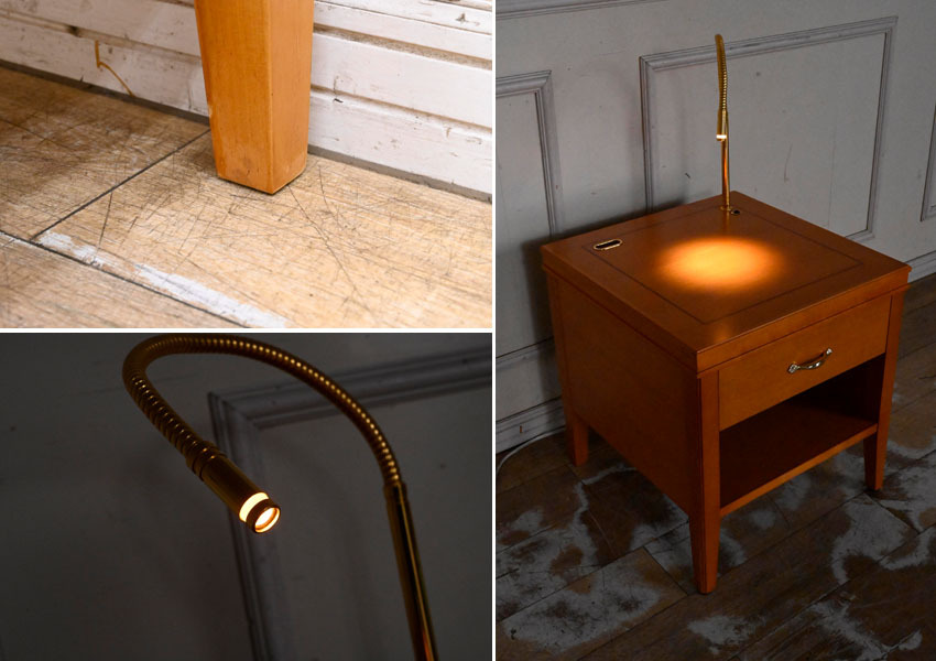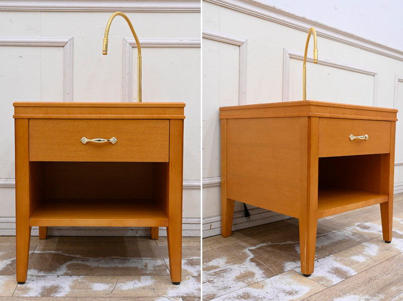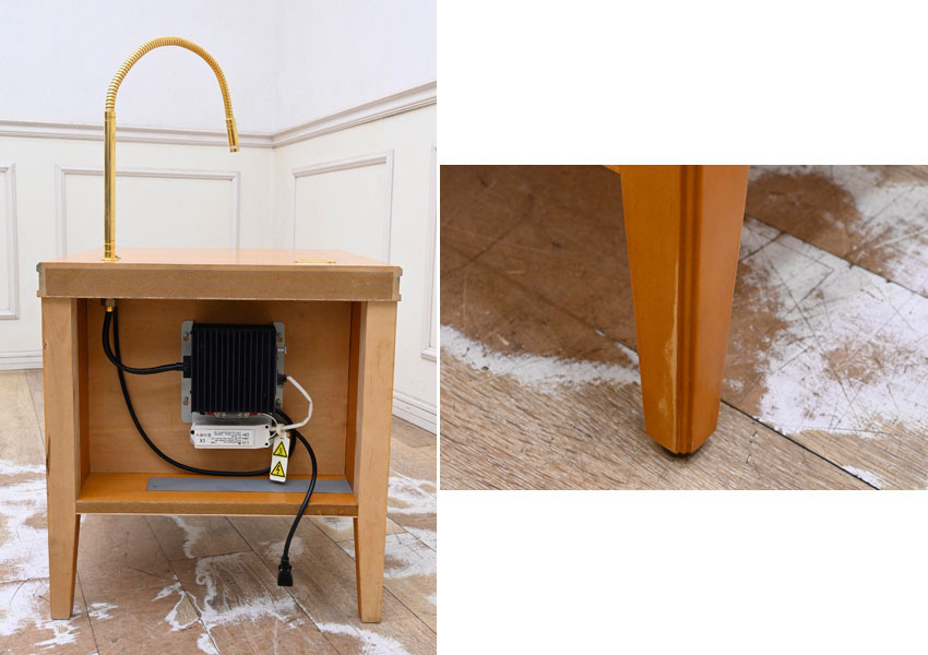----------------------------------------------------------------------------------------- ●送料や注意事項は必ずご確認下さい。落札後にトラブルになるケースが増えております。● ◆コンディションは写真・文章にて記載して有りますが、全てのキズの写真は掲載致しておりません。大きなダメージを除き見落とし、記載漏れが有る事はご了承下さい。 ◆当サイトにて出品する商品は多種多彩で、当方商品知識の無い物も多数ありますので落札後の質問やメンテナンス等にはお答えできません。 ◆入札された時点で、画像、文章をご理解していただいたものと判断させていただきます。不明な点は前もってQ&Aからお願い致します。入札後の質問やお電話等でのキャンセルは一切受け付け致しません。 ◆商品説明に「ノークレーム」と記載しているものに関しては、如何なる状況で届いても保証致しません。詳しくは注意事項の「商品到着後について」の最後に記載しておりますのでご確認下さい。 ---------------------------------------------------------------------------------------- 珍しいピンスポットライト付きのサイドテーブル、中古品の出品です。 中古品ですので多少のキズ、薄汚れ、天板向かって左前角ガリ、欠け、左前脚表面コーティング浮きがあります。 蛇腹の付け根部分弱い?緩いです。 アジャスター前脚だけ付いています。後ろ脚は元々付いていなさそうです。その為少し後ろが低くなっています。 幅48 奥52(50) 高77.5 天板高52cm | ||