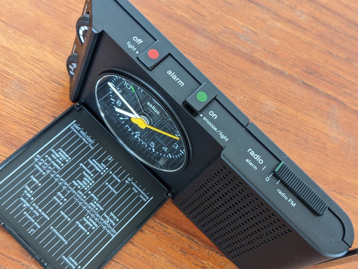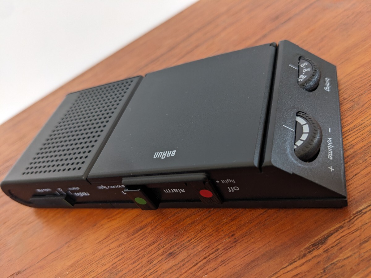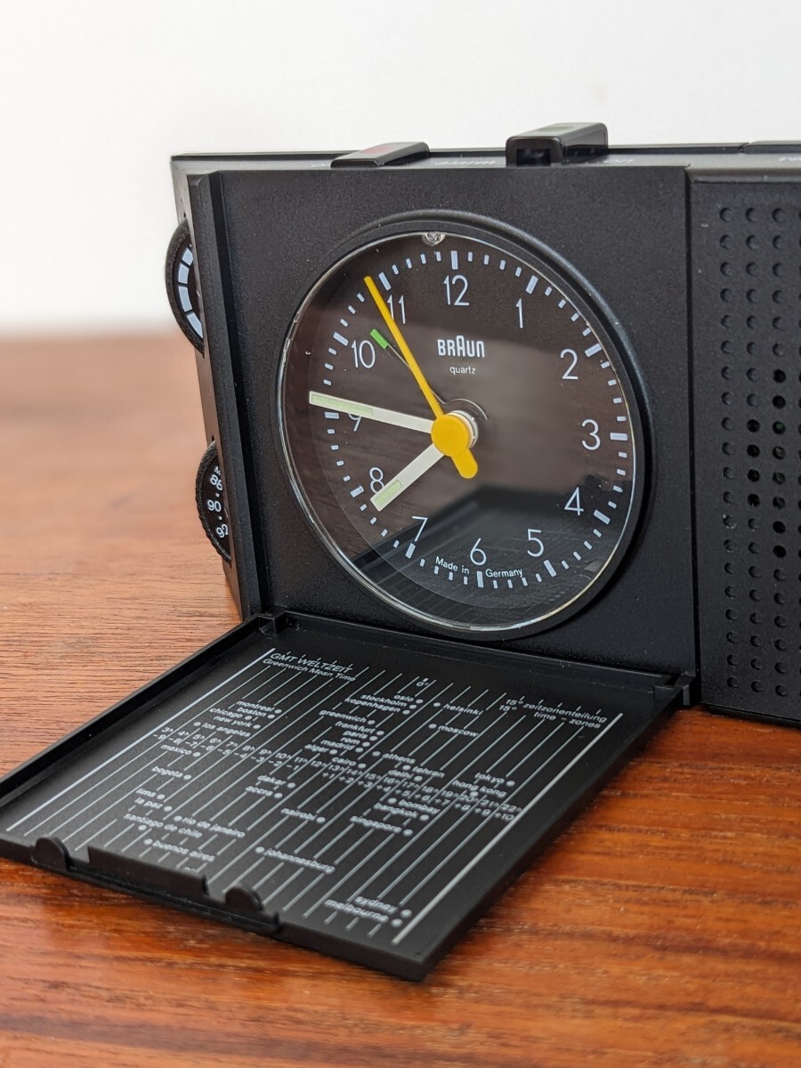 ブラウンの独創的なデザインのラジオつきアラーム時計です