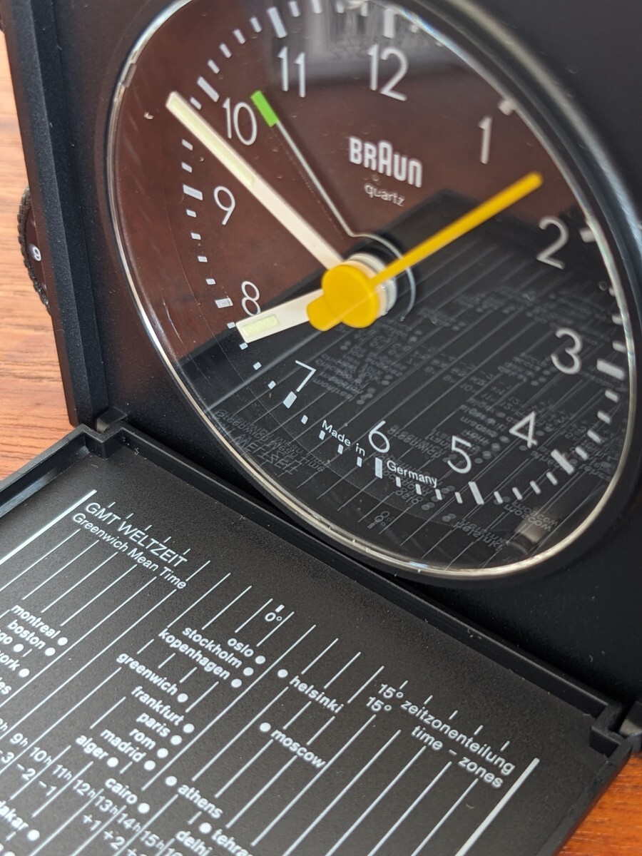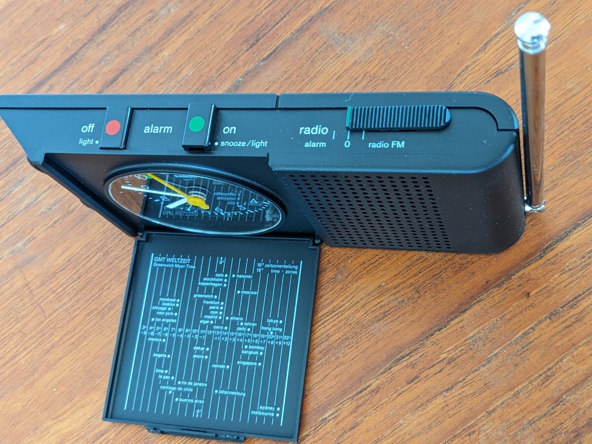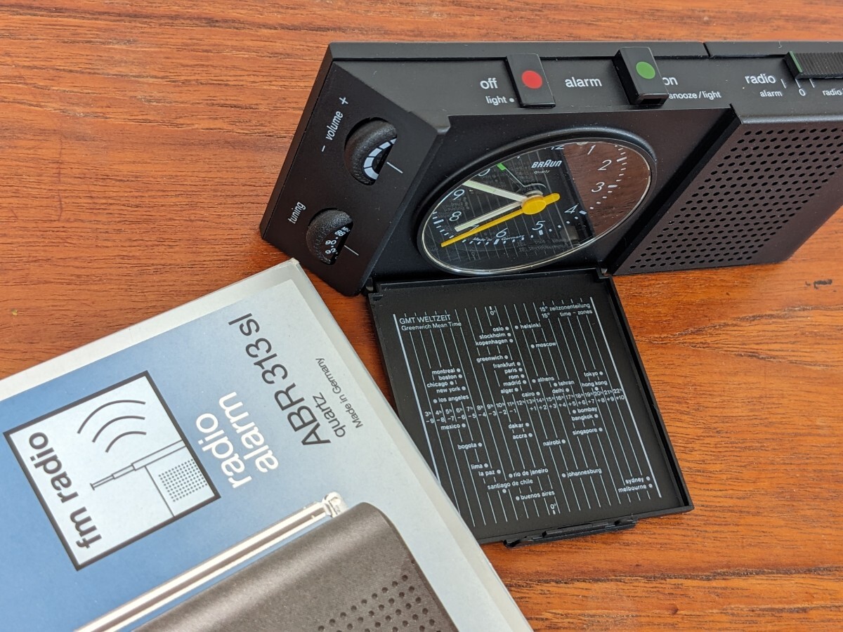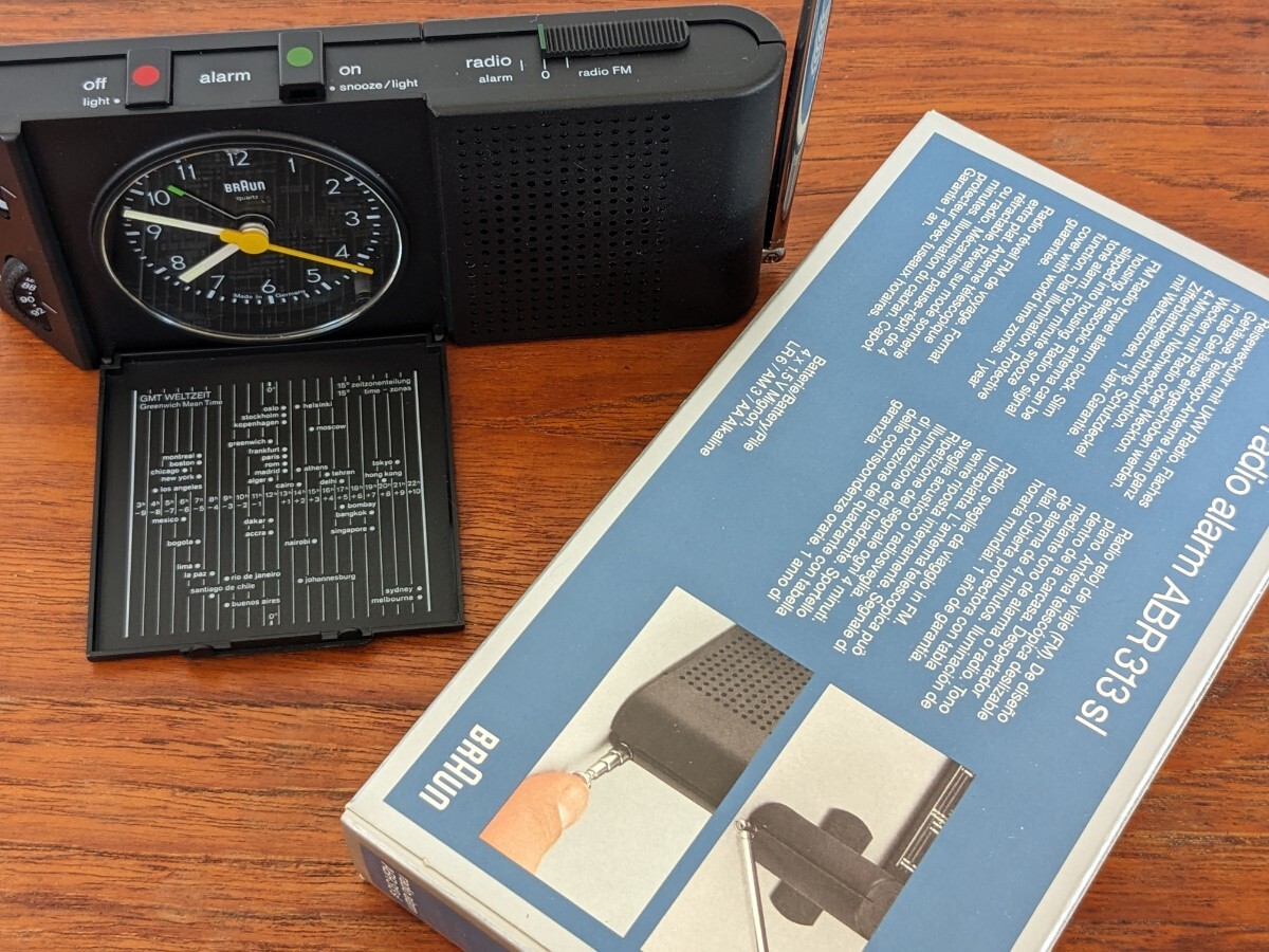 ブラウンの独創的なデザインのラジオつきアラーム時計です