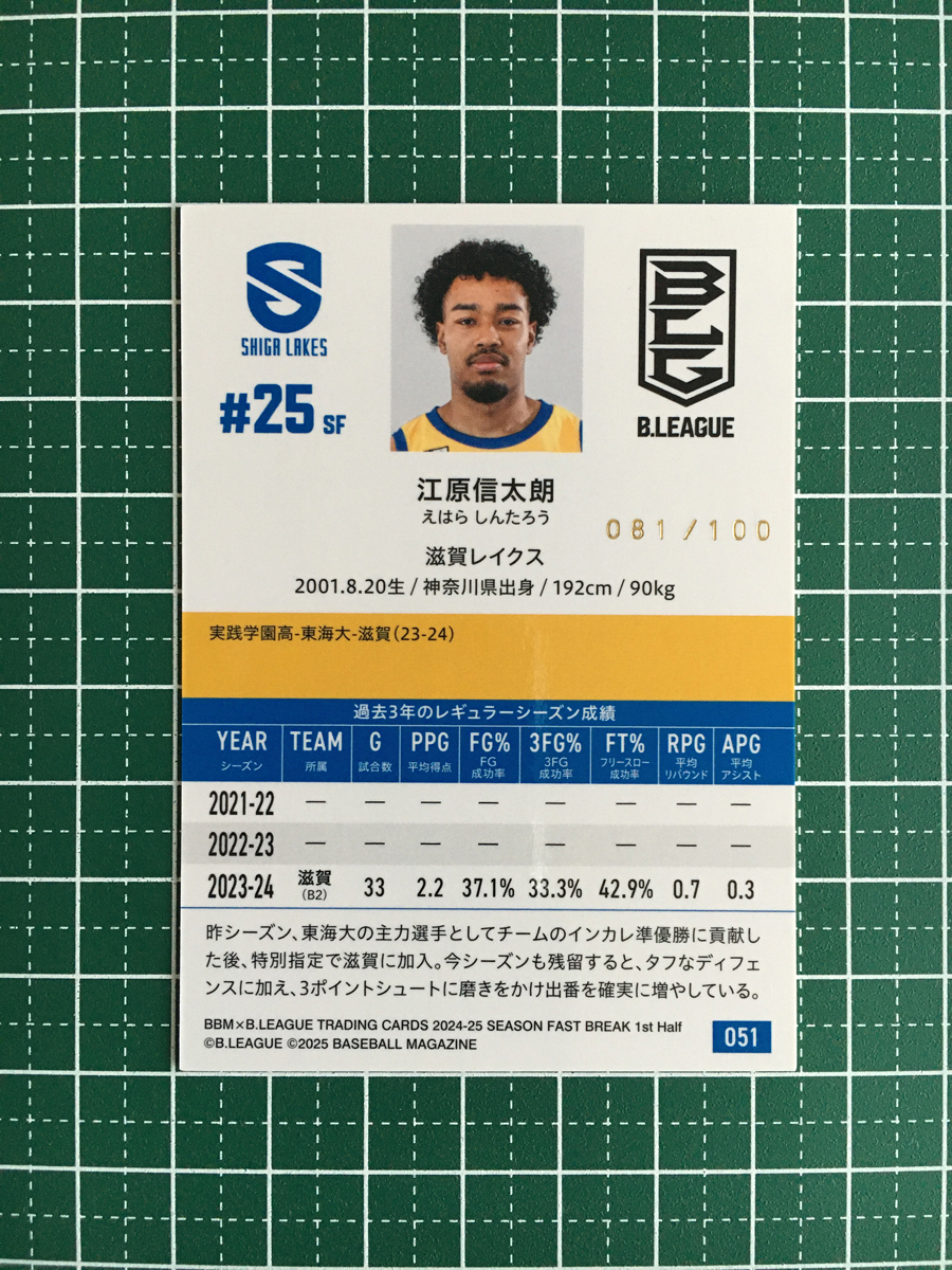 ★BBM B.LEAGUE 2024-25 FAST BREAK 1st HALF #051 江原信太朗[滋賀レイクス]銀箔サイン版 100枚限定「081/100」ルーキー「RC」★