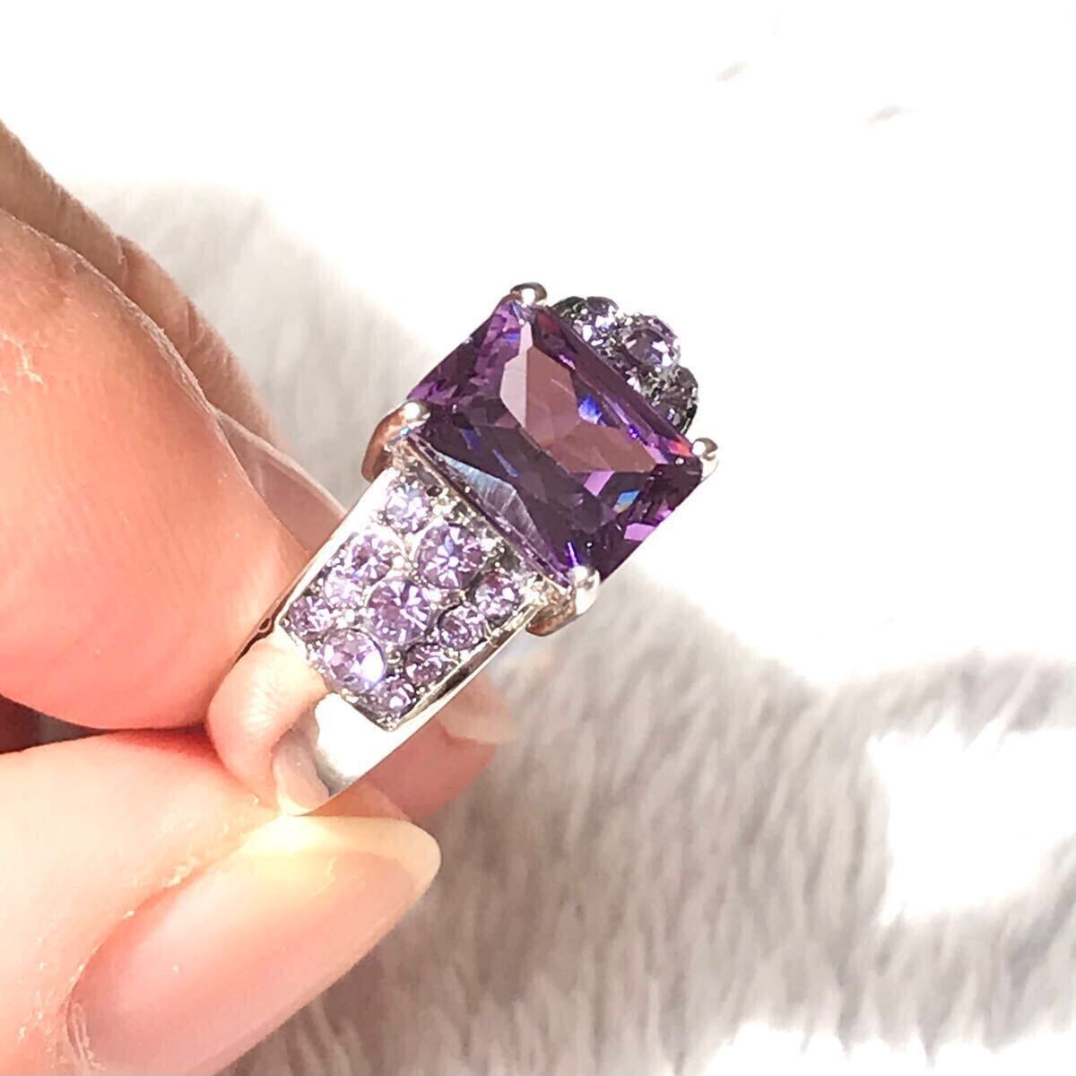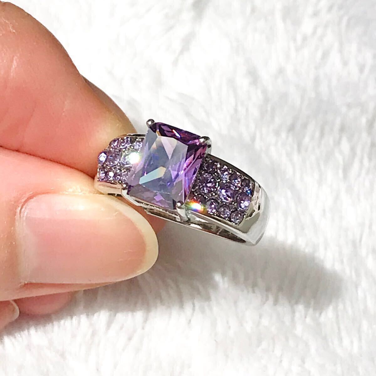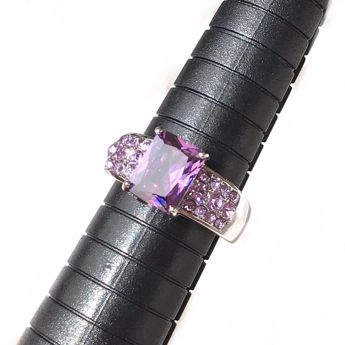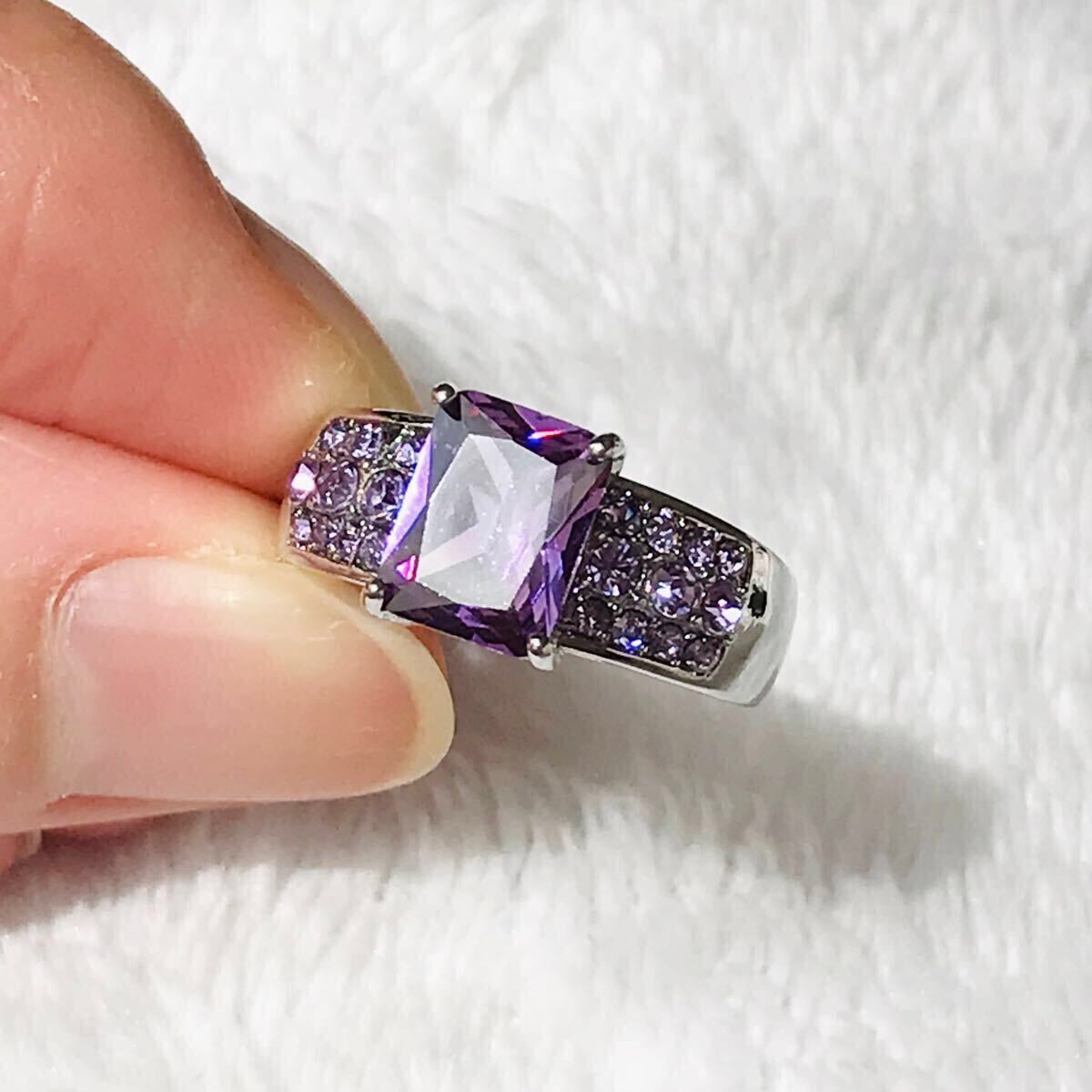 大粒にカットされたスクエアCZアメジストと、両サイド飾るCZアメジストの華やかな輝きが視線を集めるお品です。