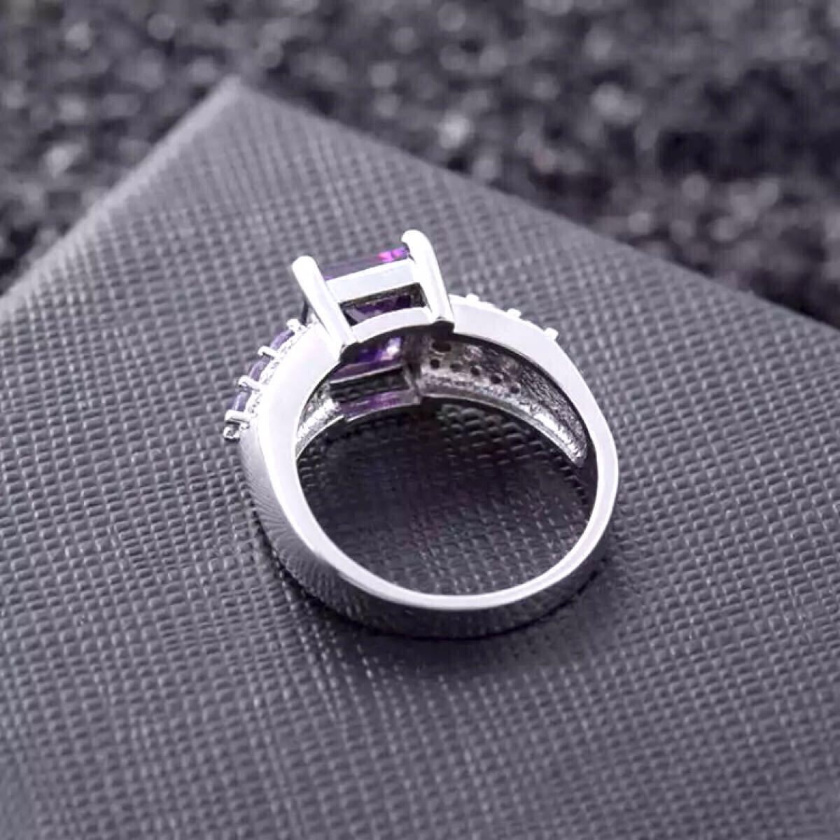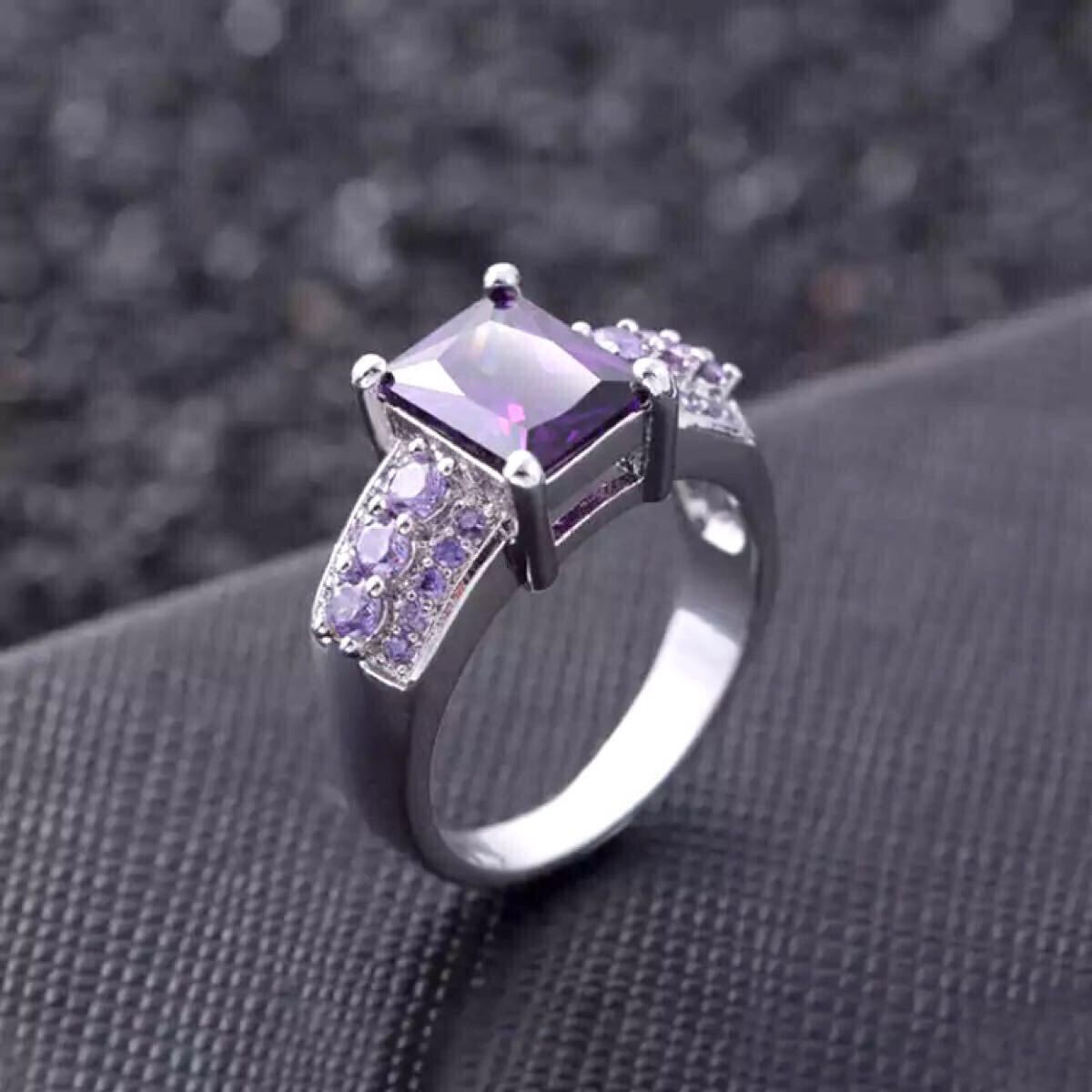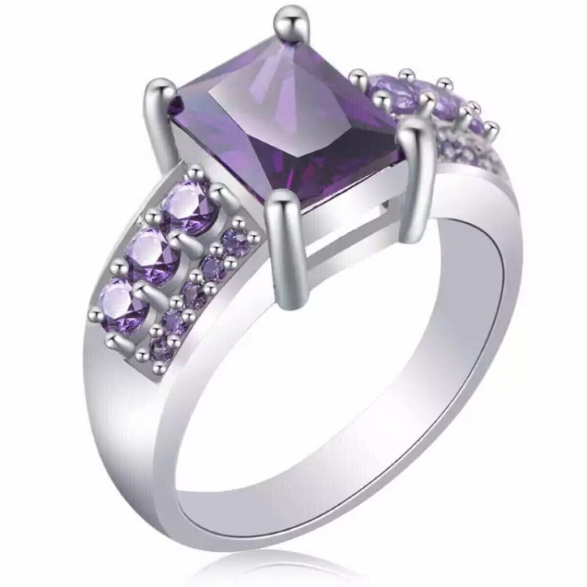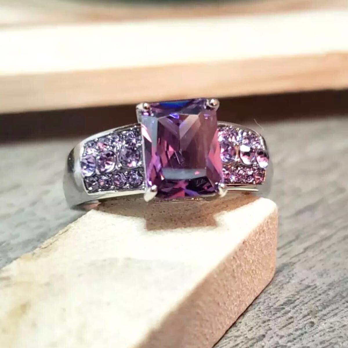 大粒にカットされたスクエアCZアメジストと、両サイド飾るCZアメジストの華やかな輝きが視線を集めるお品です。