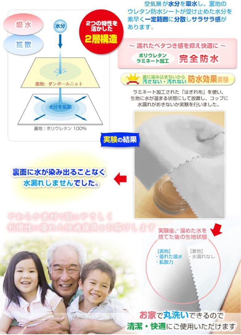 お子様用のおねしょシーツとしてはもちろん、ご病人・ご高齢の方の介護用品としても幅広くお使いいただけます。可愛いペットちゃんがお気に入りのソ ファやベットに敷いても安心です。また、おねしょ対策以外にもパパやママの寝汗対策としても活躍します。