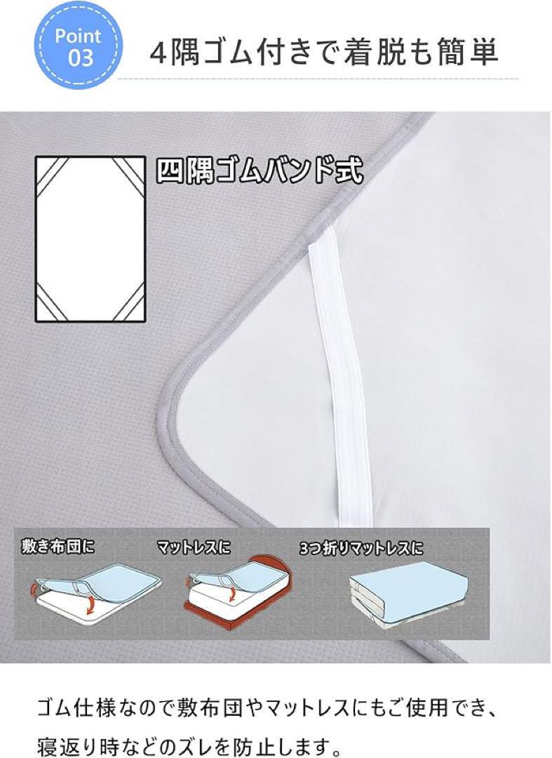四隅にゴムバンド付きで寝返りでもずれにくく、敷き布団にも、マットレスにも着脱も簡単です。