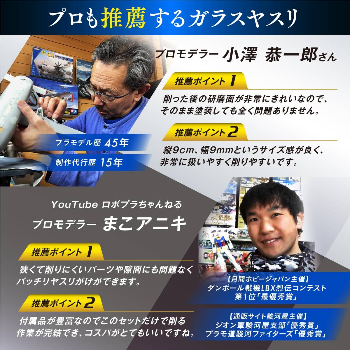 【プロ実演の解説ガイド付き】製作歴45年、販売歴10年以上のプロモデラーが監修。紙ヤスリやスポンジヤスリ等の各種ヤスリの正しい使用方法等を分かりやすく解説したオリジナルガイドが付属。