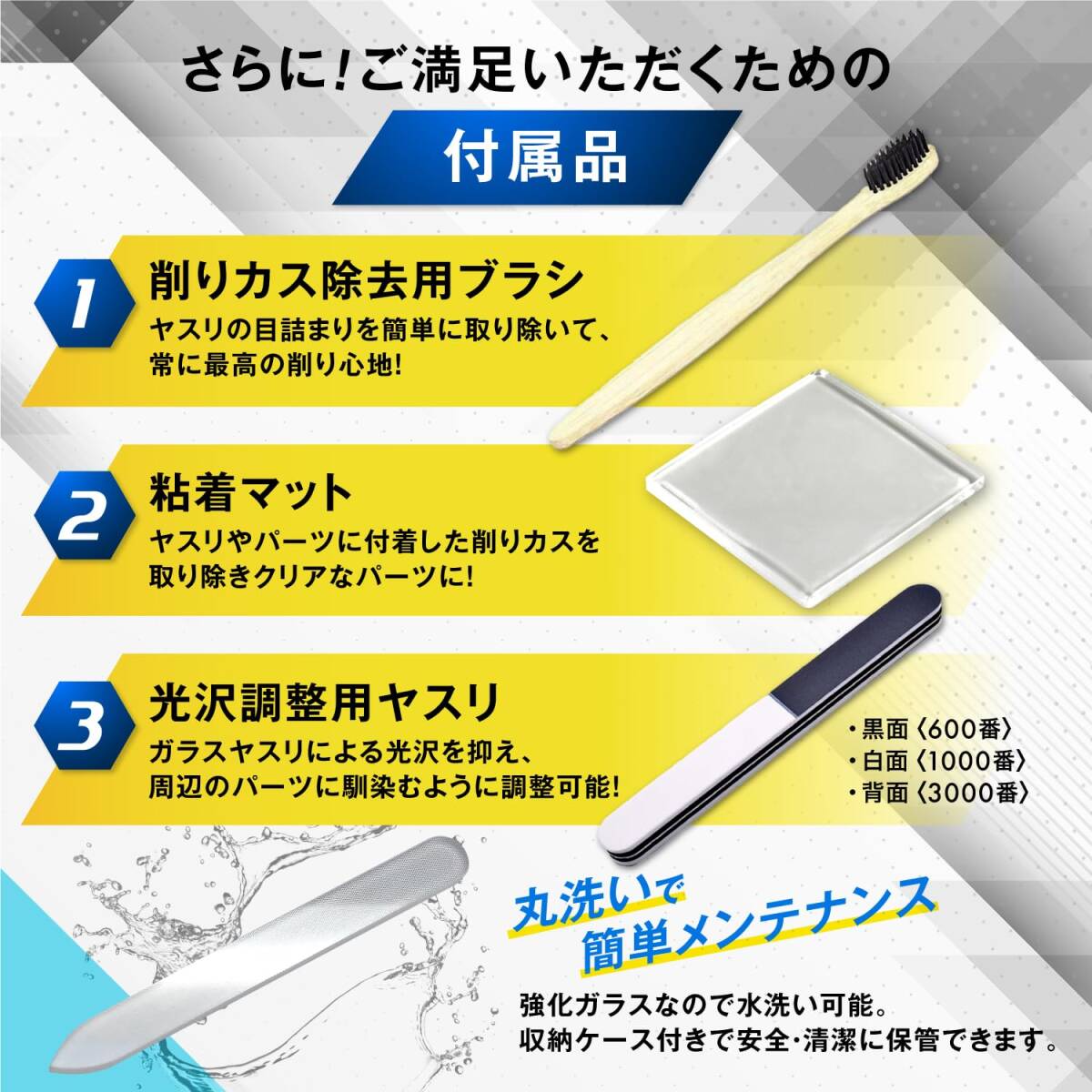 【さらに満足していただくための付属品】より快適に使用していただくために【洗浄用ブラシ】【削りカス吸着マット】【光沢調整用ヤスリ】を付属しました。このセットで全ての作業を完結できます。